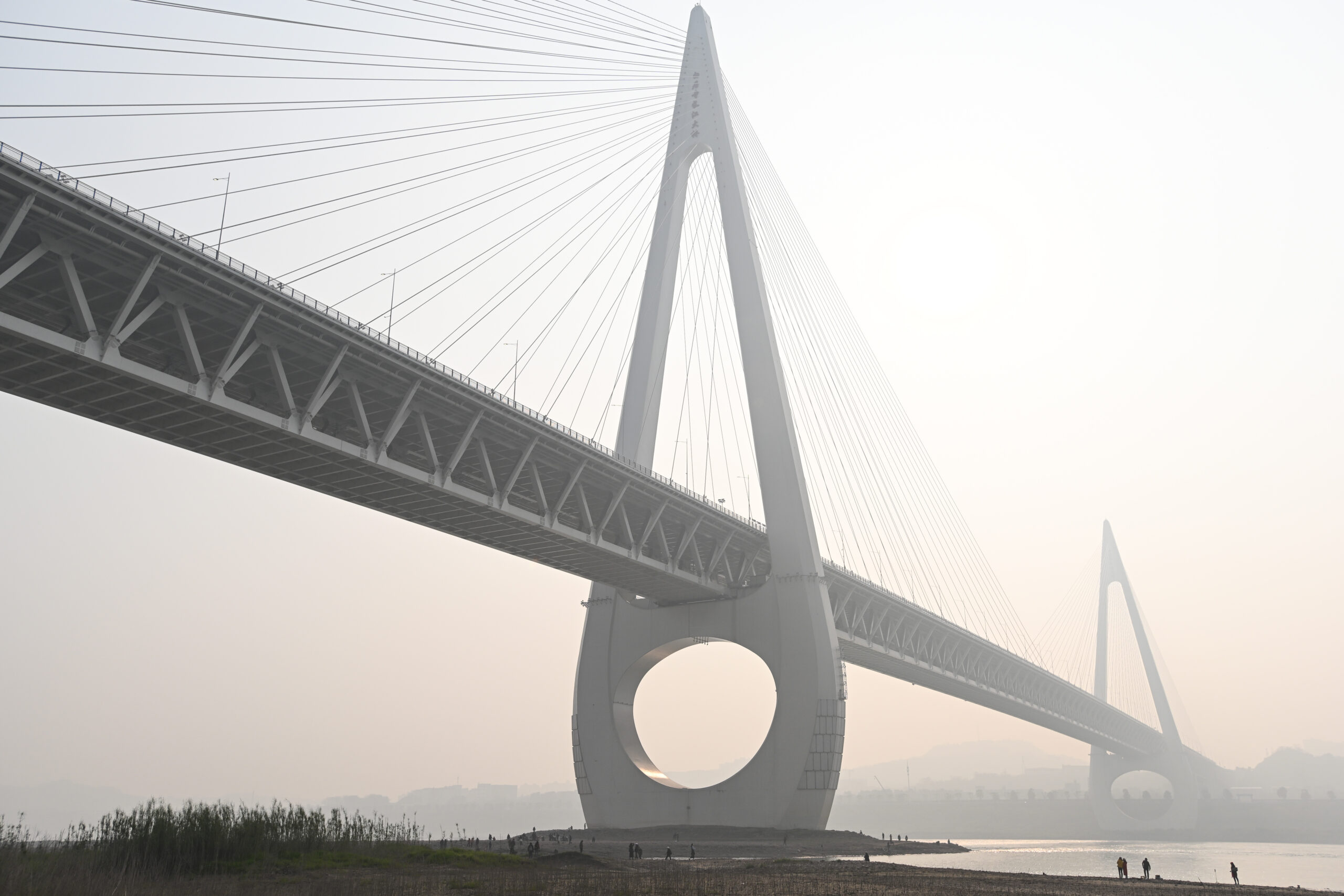 1月11日,夕阳下的重庆白居寺长江大桥。近日,重庆白居寺长江大桥因其独特的水滴造型和雄伟的桥墩设计,在夕阳映照下,如同科幻电影的现实版而走红网络,吸引民众前来“打卡”拍照,近距离感受“桥都”重庆的魅力。