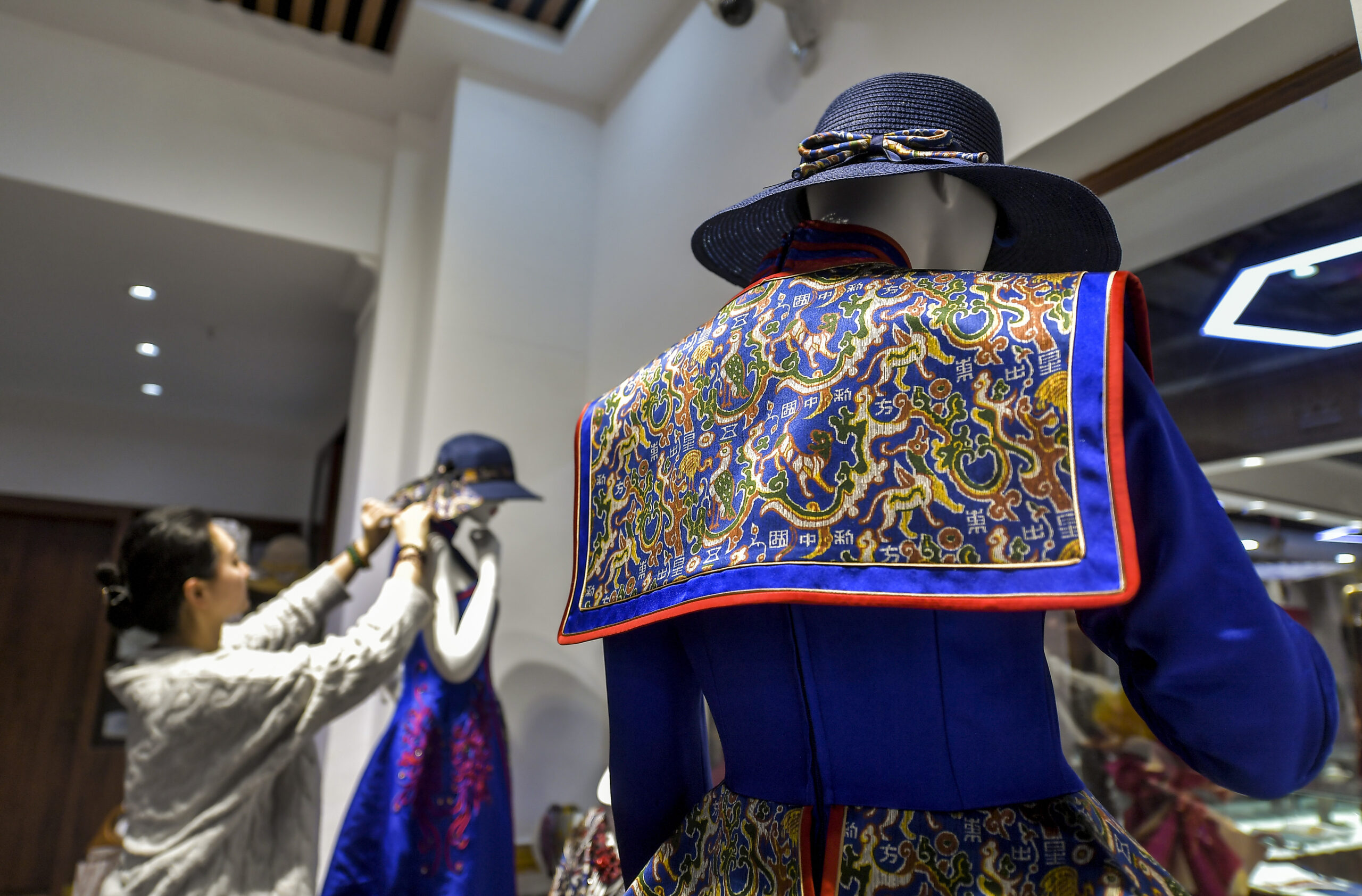 1月11日,新疆乌鲁木齐市二道桥大巴扎非遗文创馆,工作人员在整理融入“五星出东方利中国”织锦护膊图案的服饰。该馆于近日重装开馆,吸引了大批游客前来参观。据介绍,该馆汇聚了新疆非遗传承人和文创手作艺术家,此次重装开馆,在原来单纯非遗项目的基础上,增设了文创手作艺术项目,更加契合了游客对非遗文创产品的需求。
