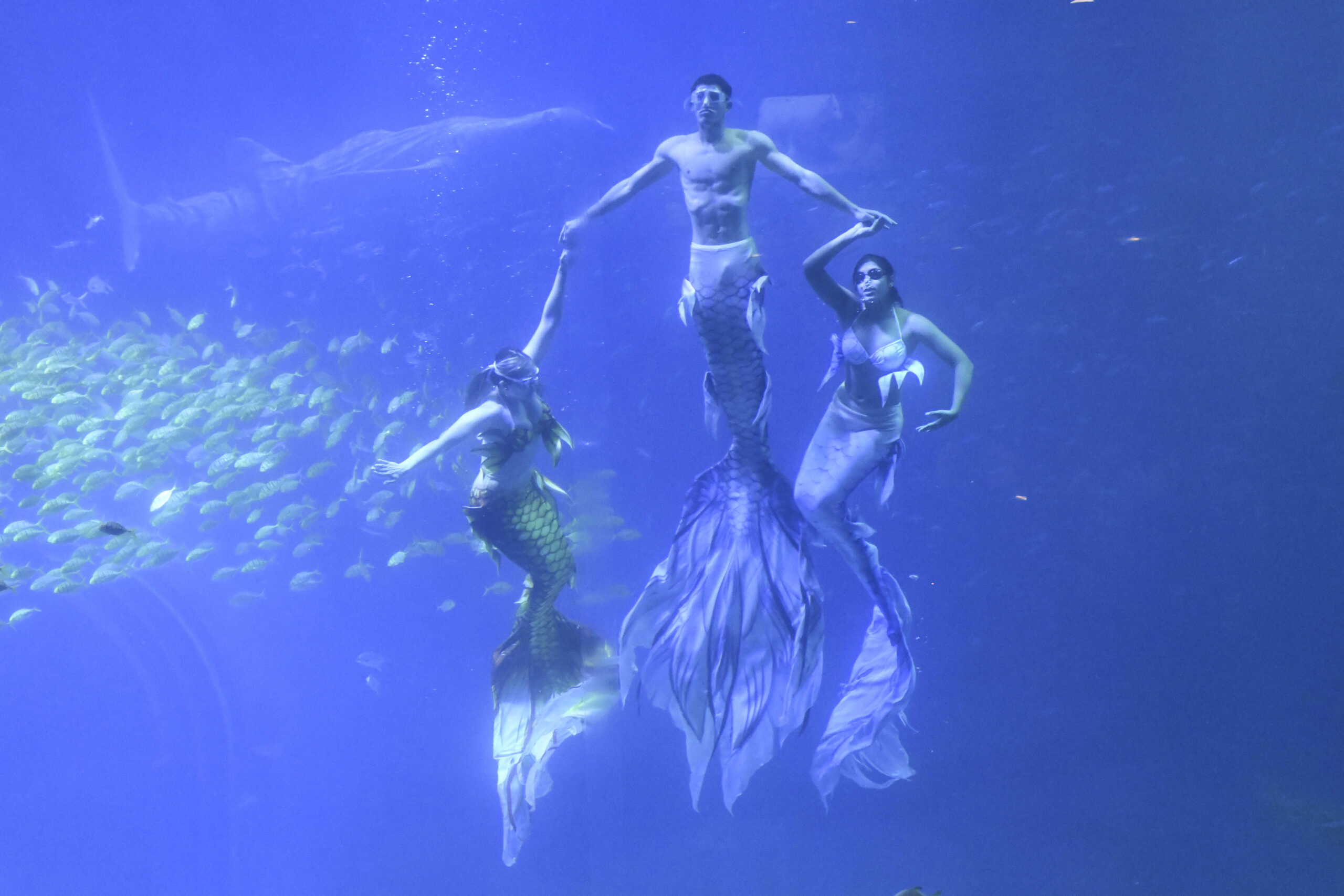1月12日,湖南长沙湘江欢乐海洋公园人鱼秘境场馆的美人鱼表演处,近日在网络上受到网友喜爱的古巴籍前跳水运动员伊曼努尔·加拉多,其进行的男性美人鱼表演吸引了众多游客前来观赏。图为伊曼努尔·加拉多(中)与其他“美人鱼”在水下表演。