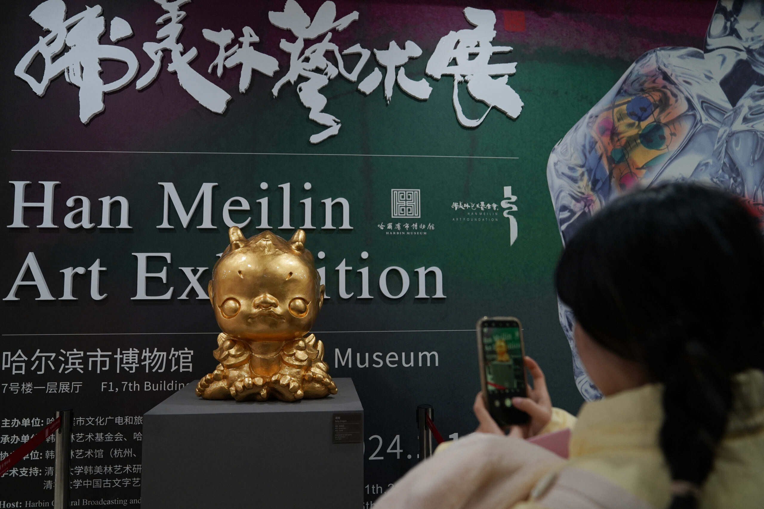 1月12日,正在哈尔滨市博物馆举行的“韩美林艺术展”上,游客参观韩美林为迎接甲辰龙年设计的雕塑作品《龙娃》。据悉,本次展览共展出作品近300件,从书法、绘画、雕塑、铁艺等不同艺术门类,到视觉艺术、设计艺术、公共美术、城市景观等各个领域,彰显出艺术家韩美林的浪漫主义情怀和对生命的激情表达。