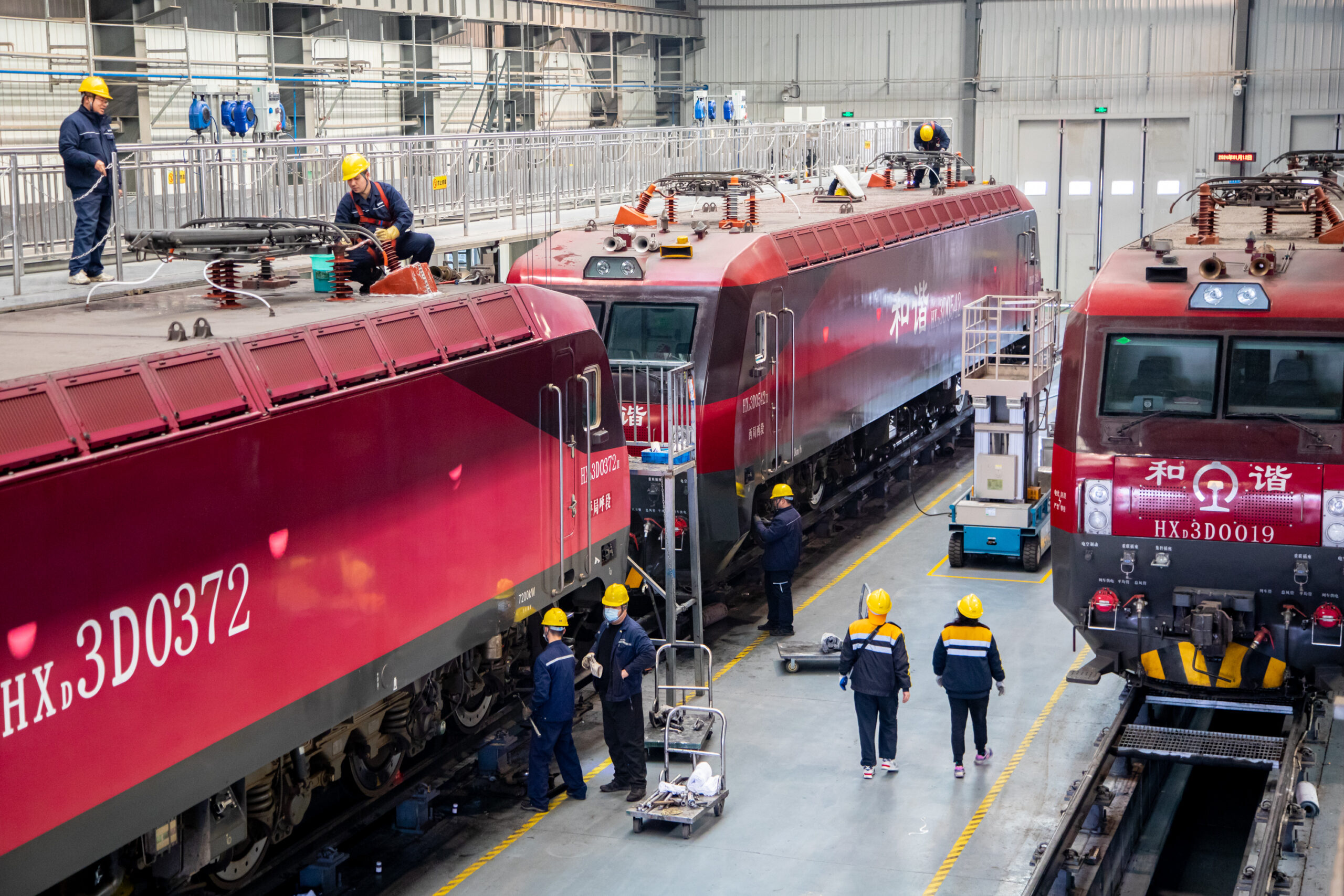 1月12日,陕西西安,西安机务段检修库职工对电力机车进行全方位检修。为确保春运期间旅客列车运行安全,中国铁路西安局集团有限公司西安机务段提前部署,制订详细的整修计划,确保机车质量可靠、性能优良,为旅客列车安全运行做好保障。