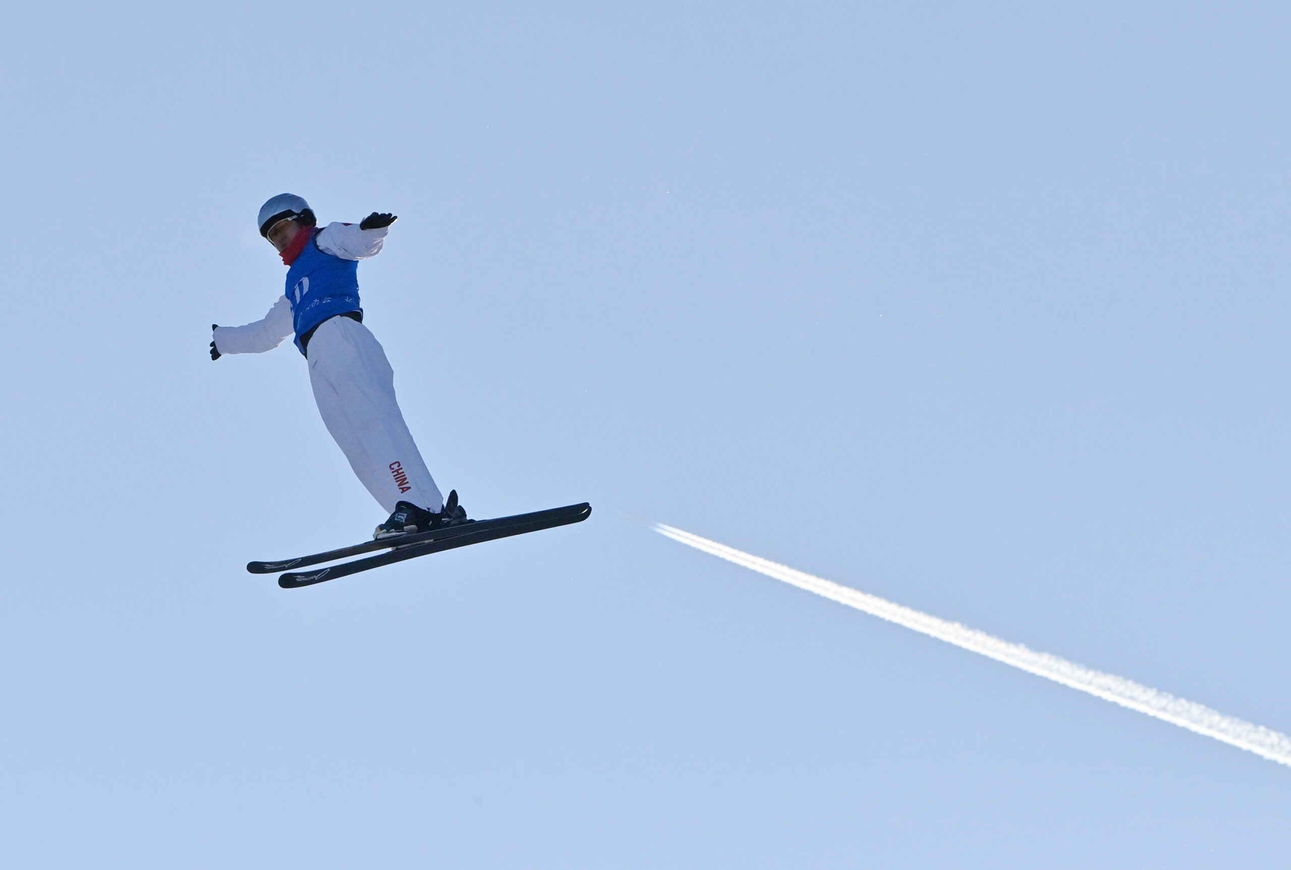 1月15日,2023-2024赛季全国自由式滑雪空中技巧冠军赛在吉林长春莲花山滑雪场开赛。本次比赛为期6天,设有个人比赛暨自选动作(公开组、青年组)、混合团体(公开组、青年组)、精英动作、规定动作、双人同步等项目。图为运动员王心迪在男子个人比赛中。