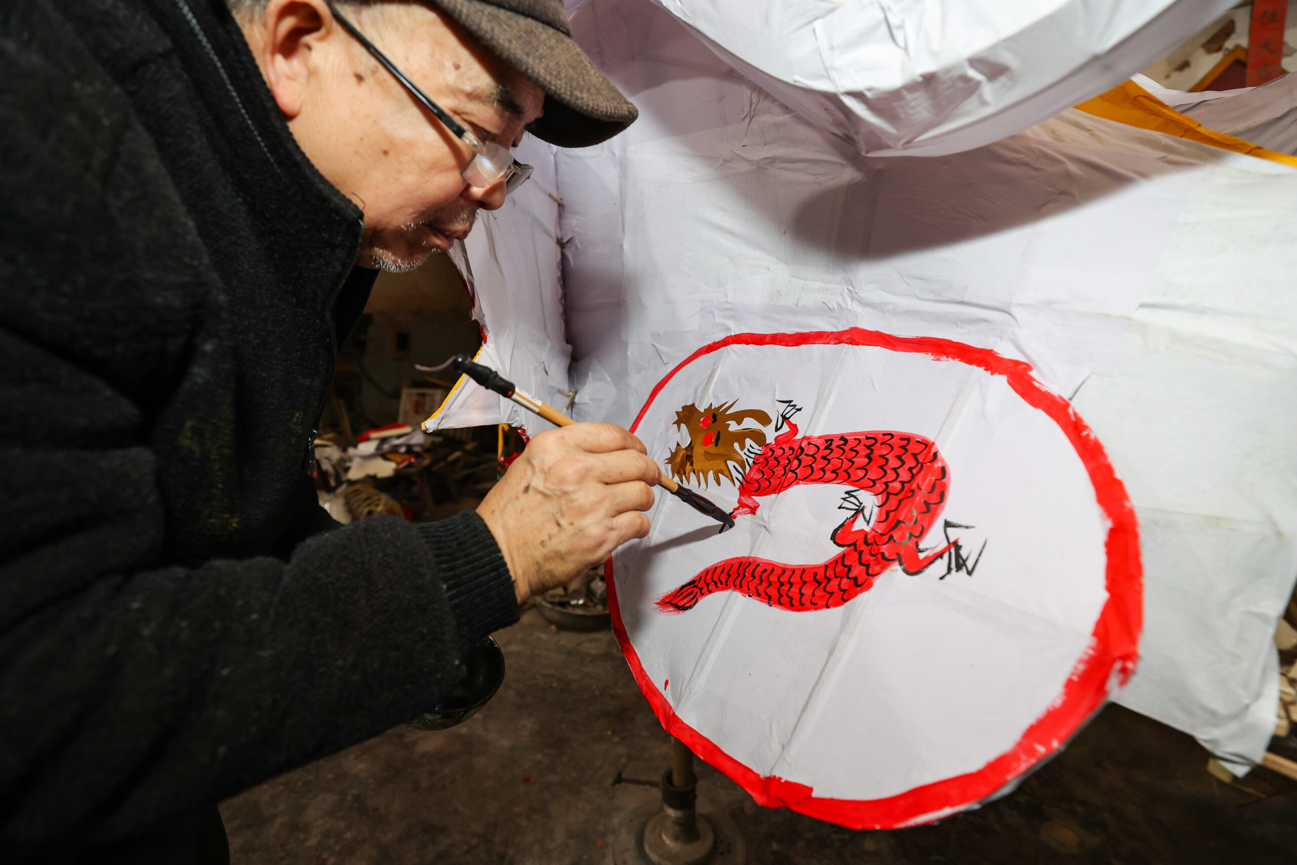 1月17日,贵州思南,刘裔松在半成品龙灯上画龙。农历龙年春节临近,贵州省铜仁市思南县许家坝镇72岁的民间手艺人刘裔松和妻子忙着制作龙灯,迎接龙年的到来。龙灯制作要经过设计、扎骨架、糊纸、绘图、上色等30道工序,对制灯艺人的艺术素养和制作技艺有较高要求。刘裔松学艺至今,已经扎了近50年龙灯。刘裔松介绍,许家坝镇每年农历正月十三都要开展“炸龙灯”习俗活动,镇内每个村至少要出一条龙灯。他说,“马上龙年就要到了,预定的龙灯比往年更多,目前已经有70条龙灯初步制作完成。”