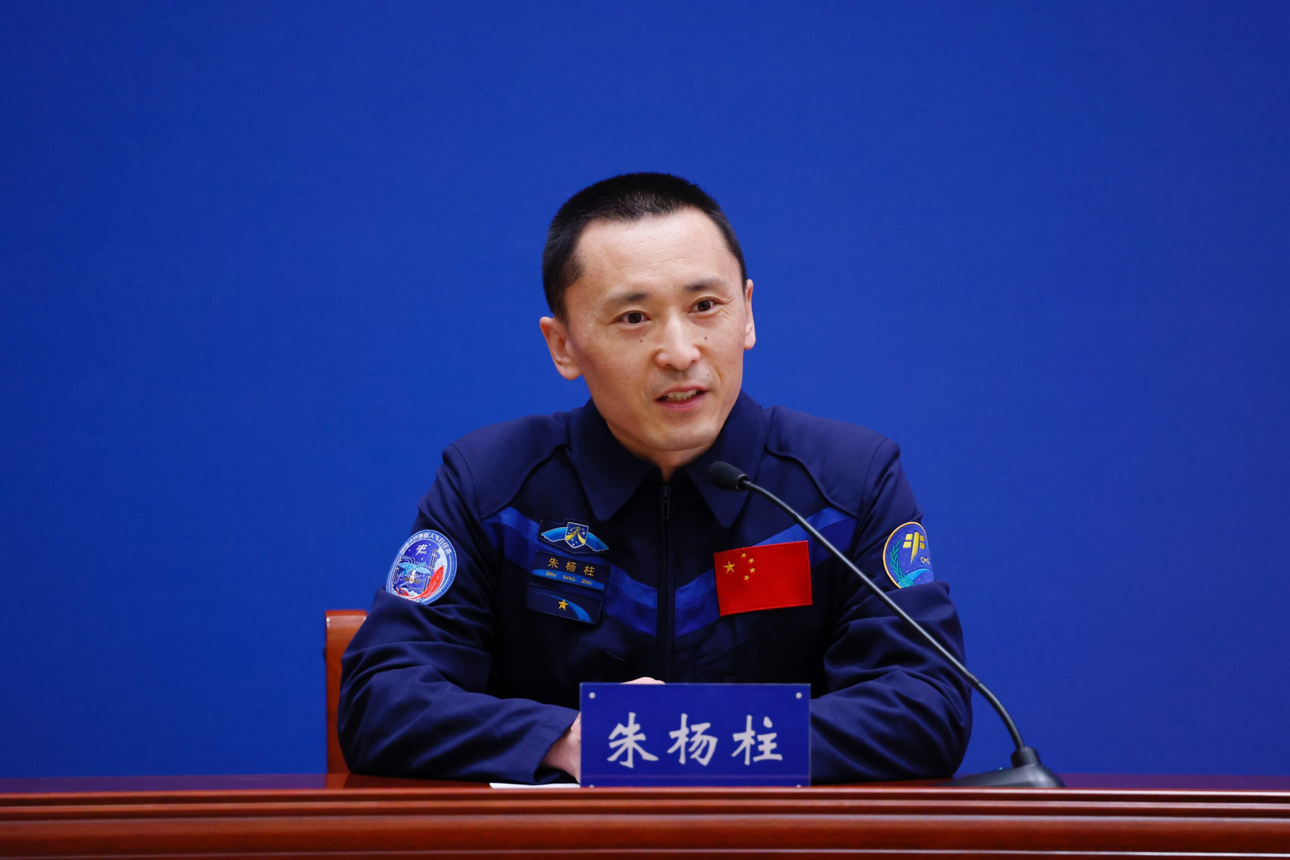 1月19日下午,中国航天员科研训练中心在北京航天城举行神舟十六号航天员乘组与记者见面会。景海鹏、朱杨柱、桂海潮3名航天员从太空返回80天后首次正式公开亮相。图为朱杨柱回答记者提问。