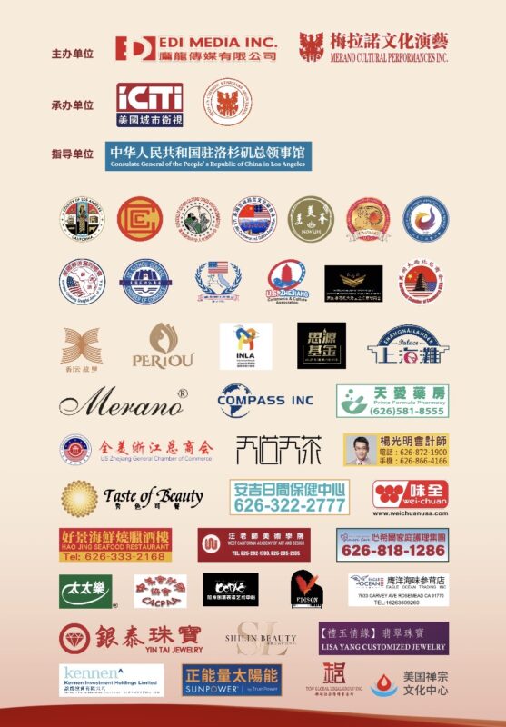 本次活动感谢美国苏浙沪同乡会、中美会计师协会、橙县华人商会基金会、美国浙江经贸文化联合会、北美高校联合会、美国苏州总商会、汪老师美术学院、杨光明会计师、银泰珠宝、天爱药房、好景海鲜烧腊酒楼、心希尔家庭护理集团、安吉日间保健中心、诗琳美容护肤中心、郝琦联合律师事务所、味全食品、鹰洋海味参茸店、正能量太阳能、美国东锦国际企业有限公司、全美浙江总商会,美国加州温州同乡会,粤港澳大湾区总商会,香港啟能投资,秀色可餐,德国钢琴城的大力支持(排名不分先后)。