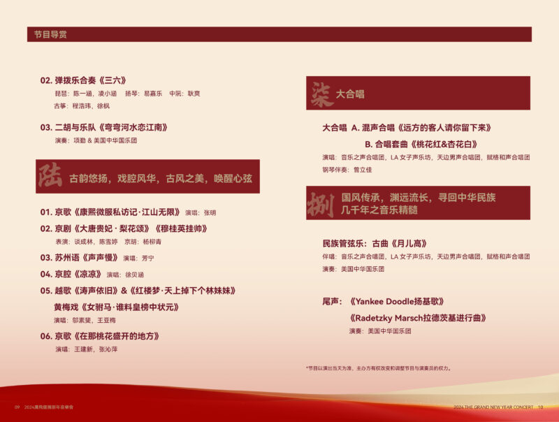 《2024鹰飞龙腾新年音乐会暨中美建交45周新年音乐会》联合主办方美国梅拉诺文化演艺总裁、本次音乐会艺术督导音乐总监李愔及执行总监邬素菲表示,非常荣幸能有机会致力于在保持民族音乐特色的同时,进一步发展和创新这场音乐盛宴。音乐会以熟悉的声音、难以忘怀的旋律、共同的青春和永恒的回忆为主题,通过各民族音乐传递大团结之声。演出还将呈现美国经典歌曲,展现音乐多样性和跨文化的魅力。古韵悠扬的戏腔和经典戏歌将唤醒心弦,回望中华传统文化。感谢文艺工作者传承中华文化,期待更多加入。期待1月27日的音乐盛宴,祝愿大家新年充满喜悦和成功,龙年行大运。