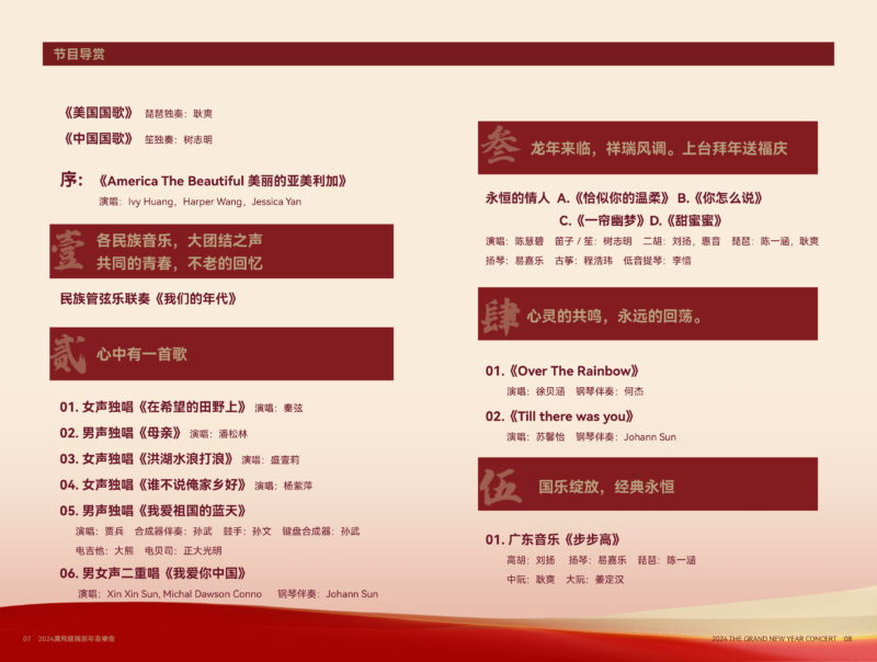 《2024鹰飞龙腾新年音乐会暨中美建交45周新年音乐会》将于1月27日(周六)在柔似蜜剧院举办;《繁花·上海之夜暨中华文化之夜》将于2月6日(周二)在西来大学剧院举办,在浓厚的新年氛围中,让大家领略中华文化之美。
