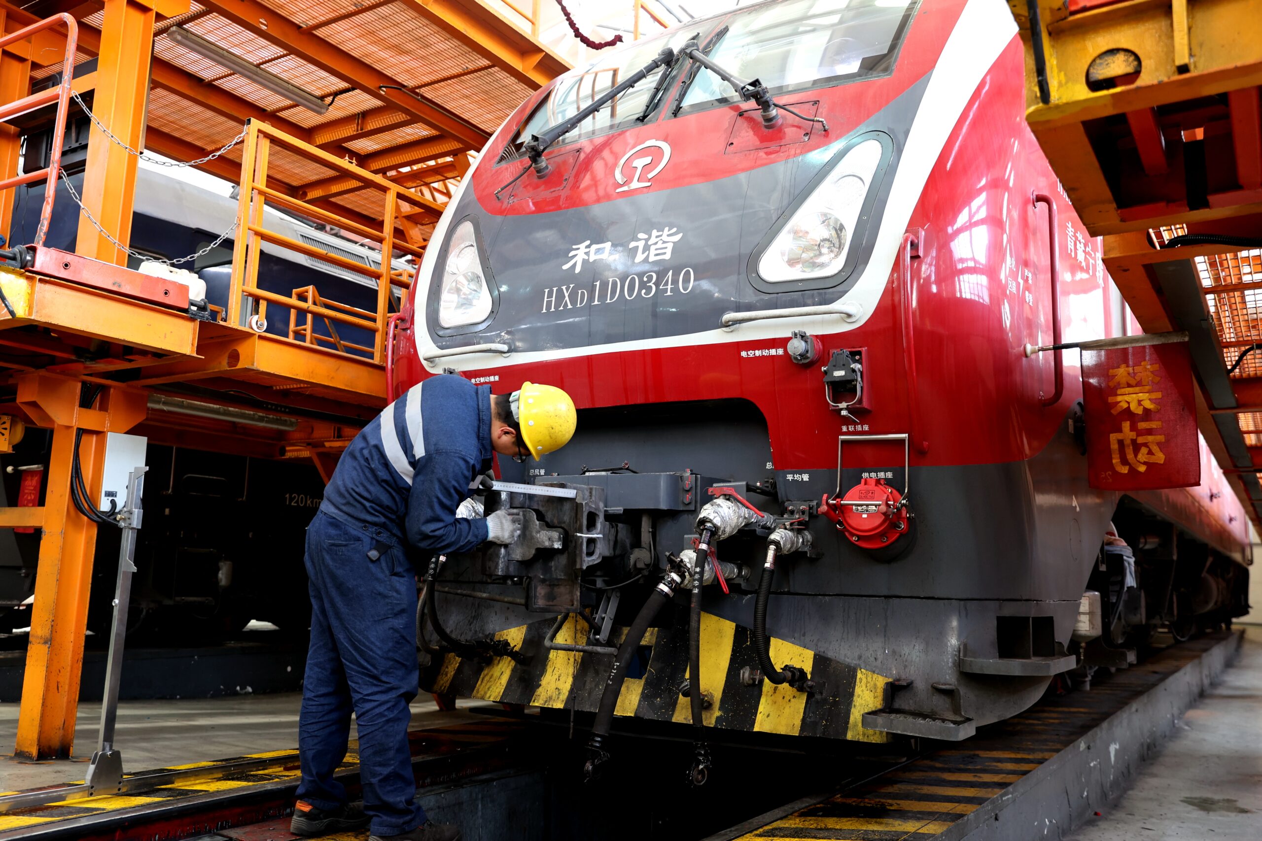 1月29日,中国铁路青藏集团有限公司西宁机务段检修车间的检修人员对过分相装置高度进行调整。为确保春运期间列车运行需求,自1月26日起,机务段检修人员将开展为期40天的春运机车检修工作,机务段检修车间全体人员坚守岗位并对248台配属的电力机车进行维护检修,为春运保驾护航。