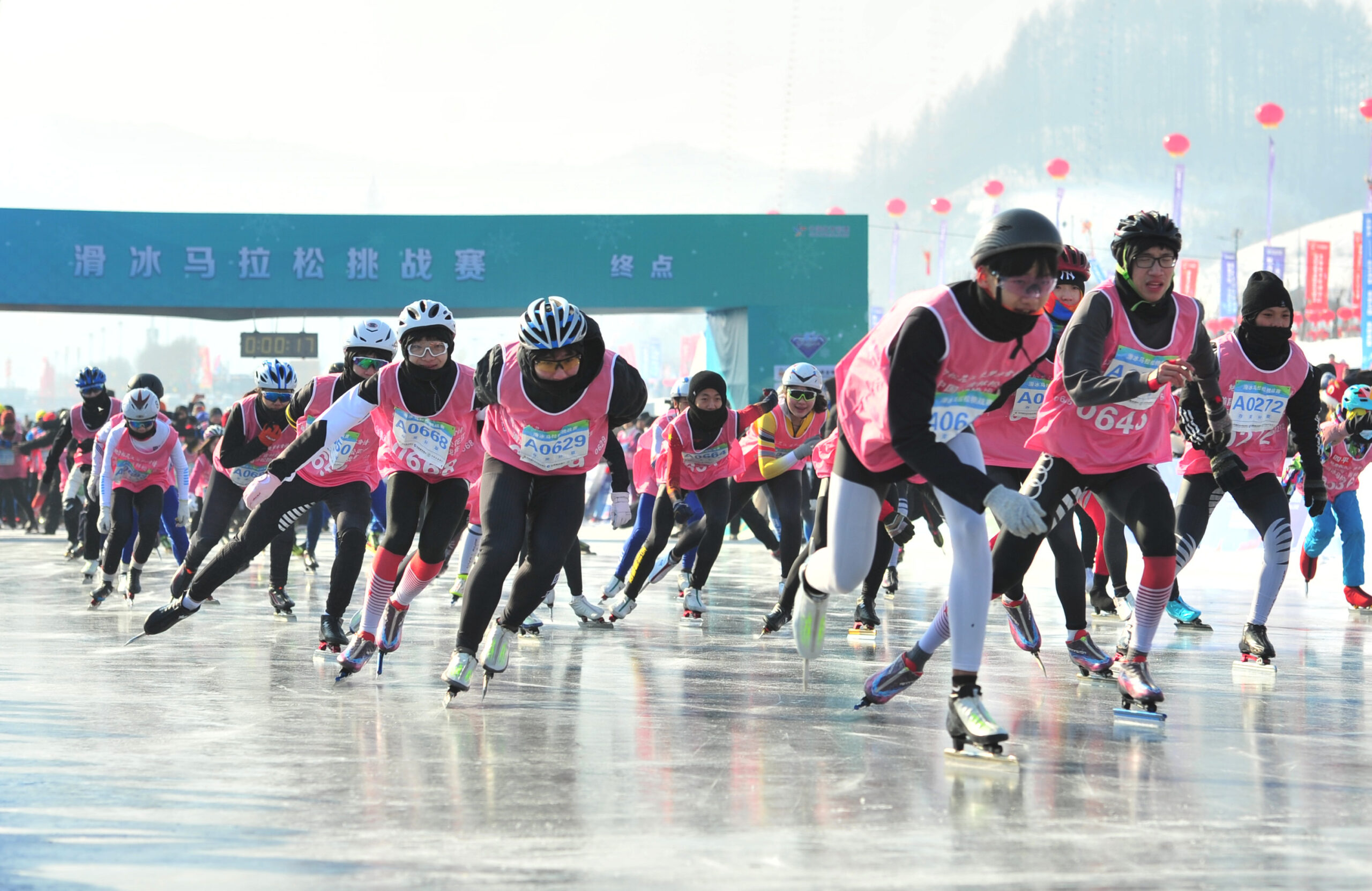 1月30日,选手在滑冰马拉松挑战赛中。当天,首届中国·吉林松花江滑冰马拉松挑战赛暨2024年全国全民健身大拜年主会场活动在吉林省白山市靖宇县举行,活动以滑冰马拉松赛为主体,同步开展10项冰雪体育赛事和10项冰雪体验活动,7000多名中外选手参赛。