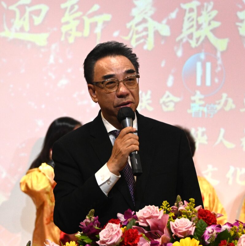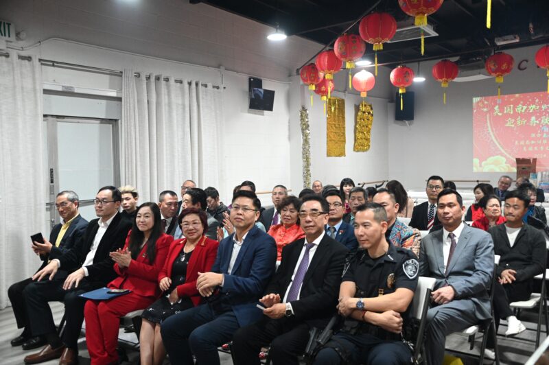 城市新闻1月28日南艾尔蒙地市报道,美国南加州华人社团大联盟在美国华人社团大联盟会所热闹举办迎新春联欢活动,并通过视频向全球华人华侨拜年。中国驻洛杉矶副总领事李春林和侨务领事安明栓、加州众议员方树强以及多位民选官员、侨团代表近百人出席。主持人孙英丽、魏林峰(左)加州众议员方树强以及与会的国会议员赵美心的代表、美国粤港澳大湾区企业家总商会会长林达坚、亚凯迪亚市市议员王爱琳、核桃市市长伍立伦、康普顿学区警局局长吴韦霖、圣盖博市市议员丁言愉、罗省中华总商会主席庄佩源、世界温州人联谊总会副会长谢浩等先后致辞,向“大联盟”送上祝福。活动由大联盟执行主席兼秘书长孙英丽和共同主席魏林峰主持。