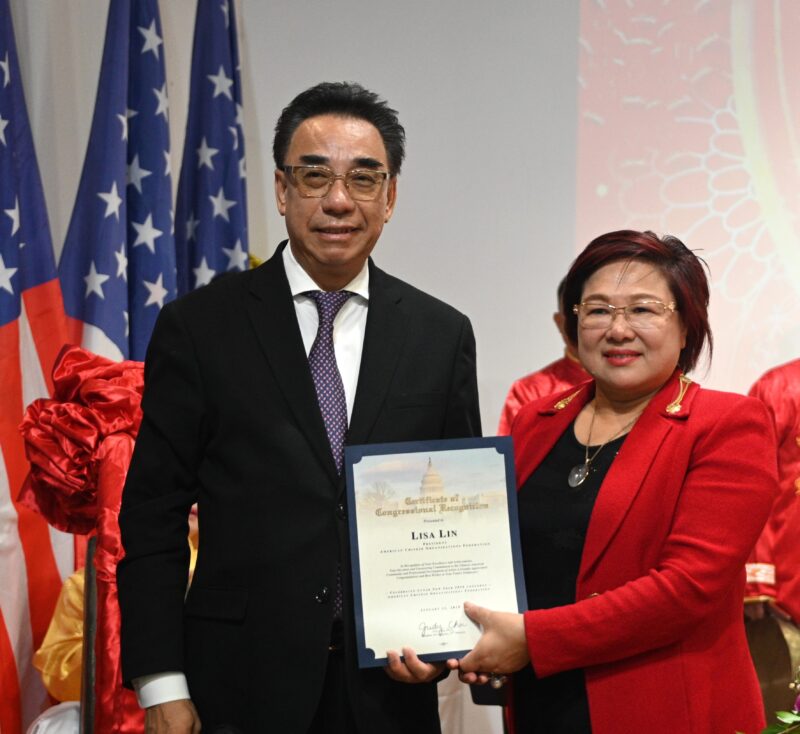 加州众议员方树强向林淦花主席、林选栋执行主席颁发贺状
