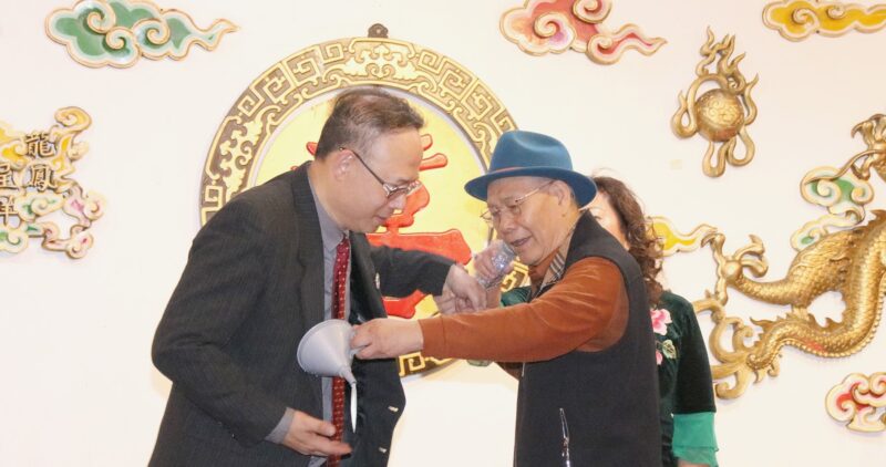 陈灿培(右)带来「搞笑魔术」、南加州广府人联谊会会长梅宁(左)