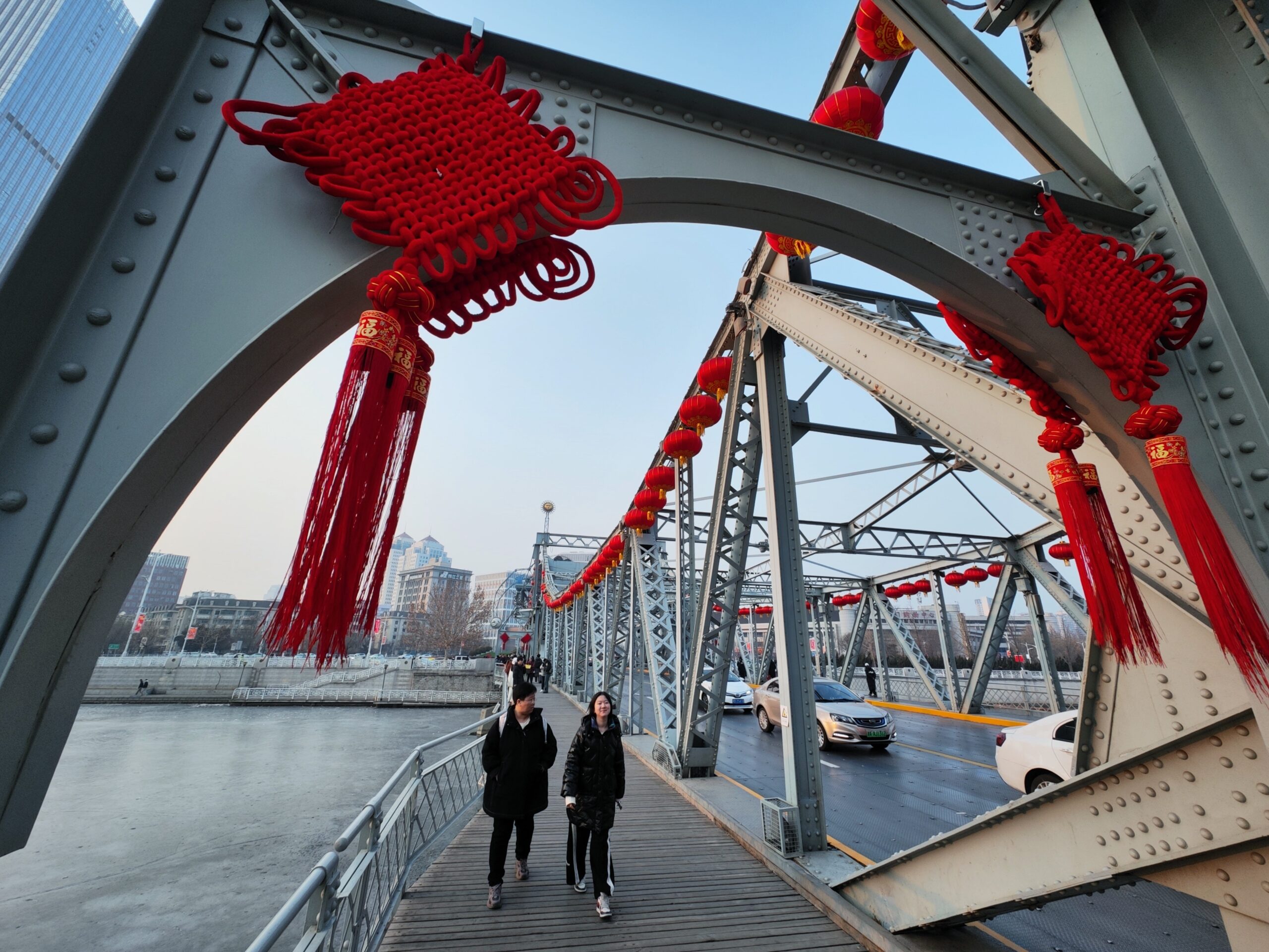 2月5日,民众从天津解放桥上经过。随着龙年春节的临近,天津海河上的多座桥梁挂上中国结、灯笼等装饰,营造出浓厚的节日氛围。
