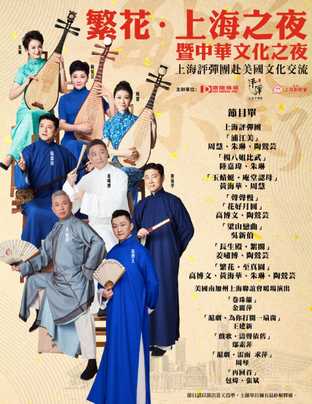由美国鹰龙传媒携手上海评弹团、美国南加州上海联谊会联合主办,中国驻洛杉矶总领馆支持的《繁花·上海之夜暨中华文化之夜》于2月6日(周二)在美国洛杉矶西来大学剧院隆重举行,为观众献上一场在美国弘扬中国江南艺术的新春文化盛宴。