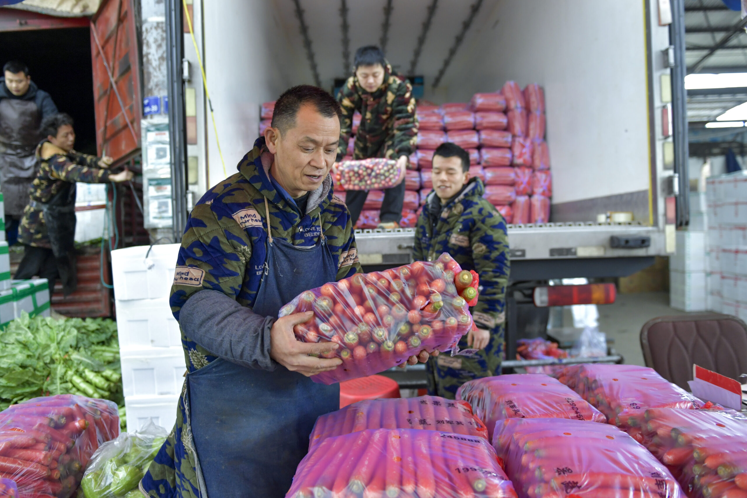 2月6日,农产品批发市场内,工人们正在装卸红萝卜。当日,四川成都海吉星市场、农产品中心批发市场等批发市场内一派繁忙景象。春节期间,成都农产品批发市场、益民菜市等24小时“不打烊”,农副产品等供应充足。