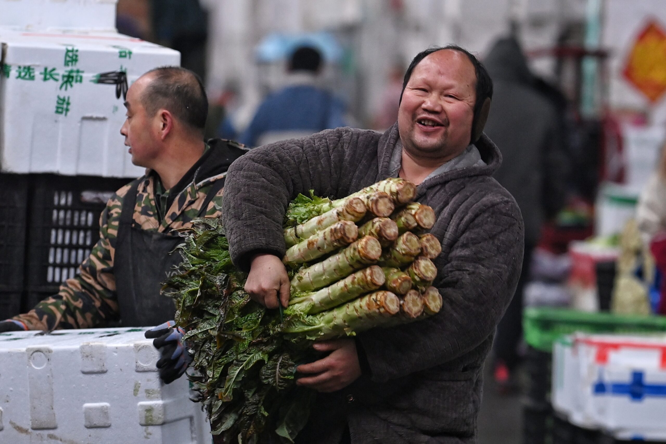 2月6日,在长沙海吉星国际农产品物流园内,市民抱着购买的莴笋。近日,长沙冰冻雨雪天气持续,长沙各农贸市场积极发动商户多方面组织货源,确保“菜篮子”稳定供应。