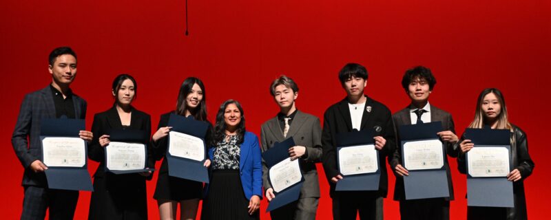 尔湾市长Farrah N. Khan(左4)向(左起)钱天慧、张雪研、陈佳妮、孙浩然、丁昊、王柳傲、胡岚心颁发新春贺状