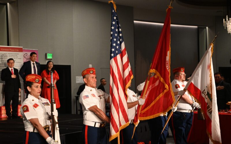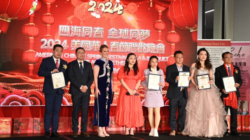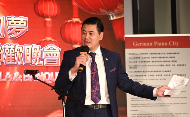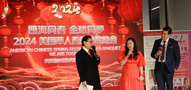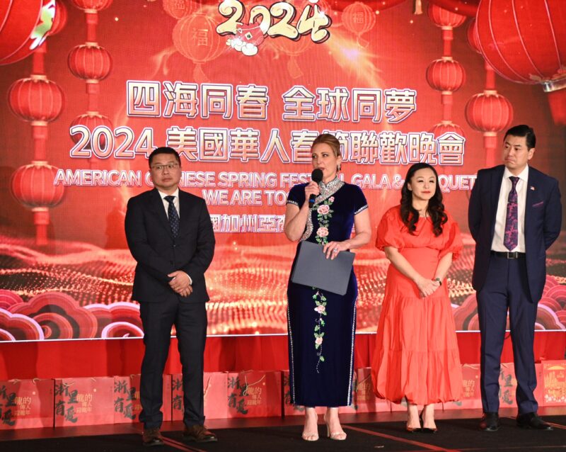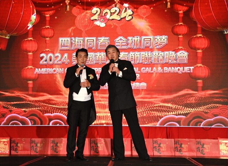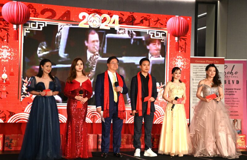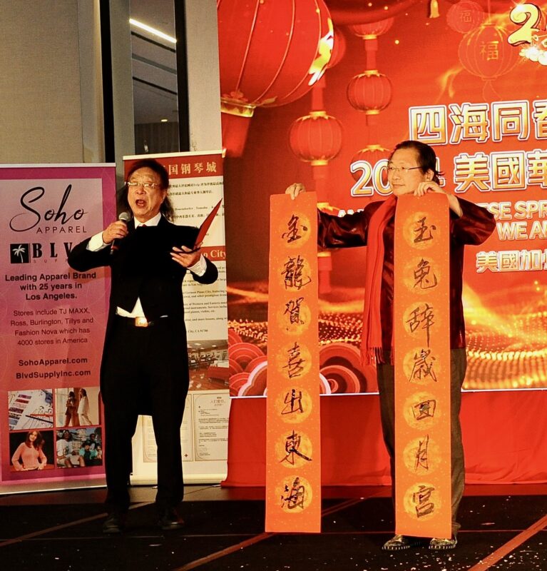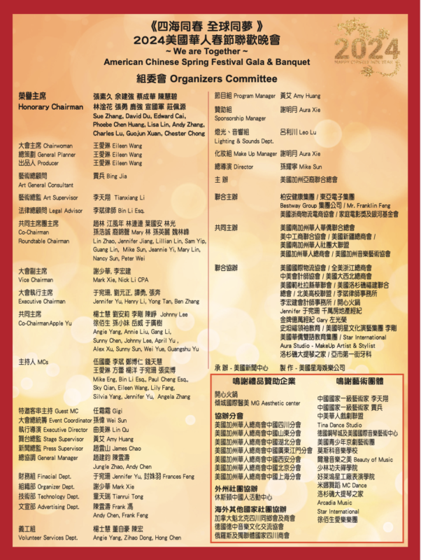 当天晚上的主持阵容豪华强大,由前加州众议员伍国庆、亚凯迪亚前市长、现任市议员郑博仁律师、亚凯迪亚市议员王爱琳、李斌律师、巾帼会执行会长方蕾、洛杉矶双语主持Gigi任霜霜、中美戏剧联盟会长杨洋、南加州华人总商会执行会长于宛珊、美西南学生联盟前会长钱天慧、青年留学生联盟秘书长张奕博九人共同主持。