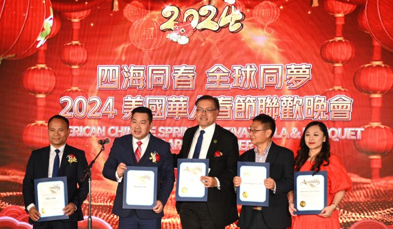 前加州众议员伍国庆(左1)、亚凯迪亚市议员郑博仁(右1)、亚凯迪亚市议员王爱琳