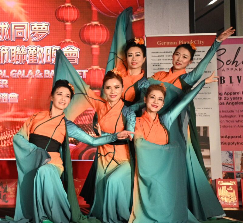 文图拉华联会演绎的两个古风服饰:《中国茶》中国红青花礼服与头饰的展示充满年味与喜庆,唐代汉服秀的色彩与头饰是晚会的压台戏,演员均来自文图拉华联会的会员,为《四海同春、全球同梦》加油。由著名画家王虹懿、书法家孙晓华联诀、国际钢琴比赛评委Sarah 张钢琴和冯先生演唱四人配合共同演绎,一个“龙”、一幅龙福对联送给观众。