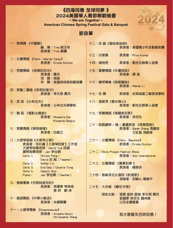 中国国家一级艺术家、全球体育舞蹈第一人李天翔、中国国家一级艺术家贾兵、女高音歌唱家杨紫萍、男高音歌唱家徐佰生、美国女高音歌唱家Ericka等分别向大会观众献出了精心准备的歌曲。大会主席、总策划、总制作人美国加州亚凯迪亚市议员、美国加州亚裔联合总会会长王爱琳表示,晚会以“四海同春全球同梦”为主题,彰显了海外华人在美国的凝聚力和文化自豪感。