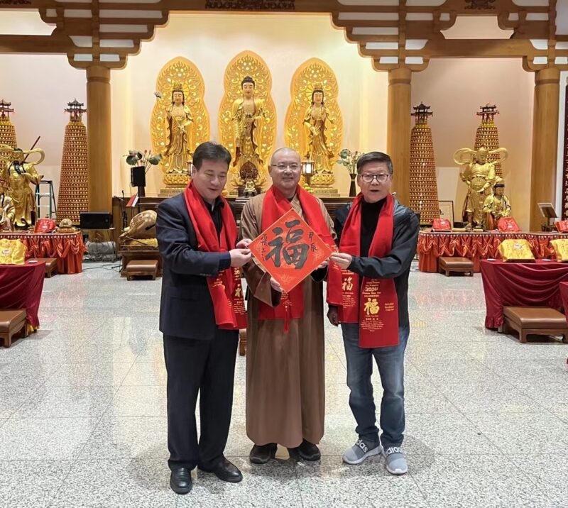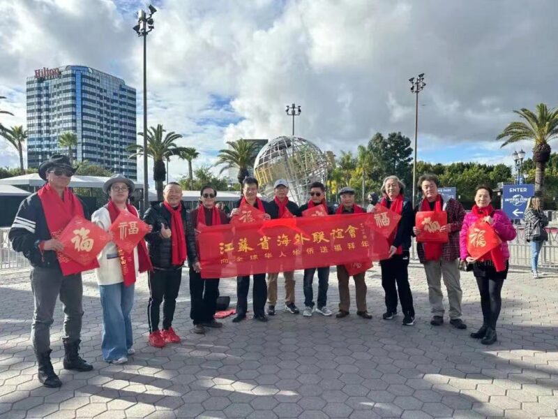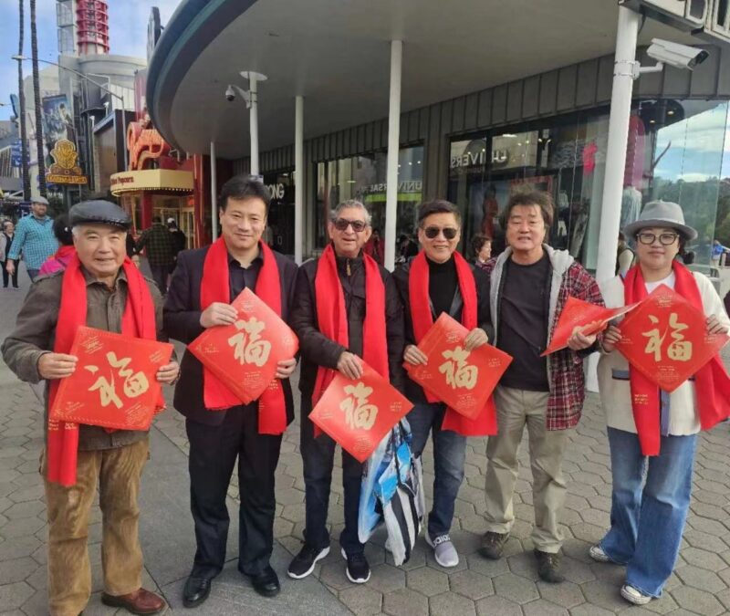 城市新闻2月10洛杉矶报导,喜迎中国龙年之际,“祥龙献瑞-中外艺术家海外送福迎春活动”走进洛杉矶好莱坞环球影城、法印寺、美国江苏总商会送福。江苏省海外联谊会副会长、江苏美国总商会会长蔡成华;美国蓝马克娱乐集团亚太地区总裁江南;江苏省海外联谊会文化艺术专业委员会副主任、江苏省中国画学会副会长兼秘书长翟优;美国中国画学会荣誉会长张宏宾、张禄杰,会长赵建民,常务副会长周平珖,副会长兼秘书长李民,副会长王岳、陈兴杰、惠君,副秘书长吴海燕、张姗姗、姜雯溪,办公室主任戴海鸿等参加了此次活动。