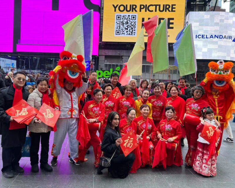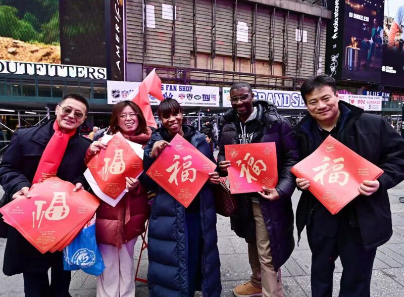 苏省海外联谊会文化艺术专业委员会副主任、江苏省中国画学会副会长兼秘书长翟优表示,自2015年开始,在时代广场为海内外各界人士举行送福祈福和拜年活,不仅华人和侨团积极参与,来自世界各地的游客也纷纷求福,把福字贴到家里,受到大家喜爱和好评,现己成为纽约时代广场每年春节亮丽的中国风景线。