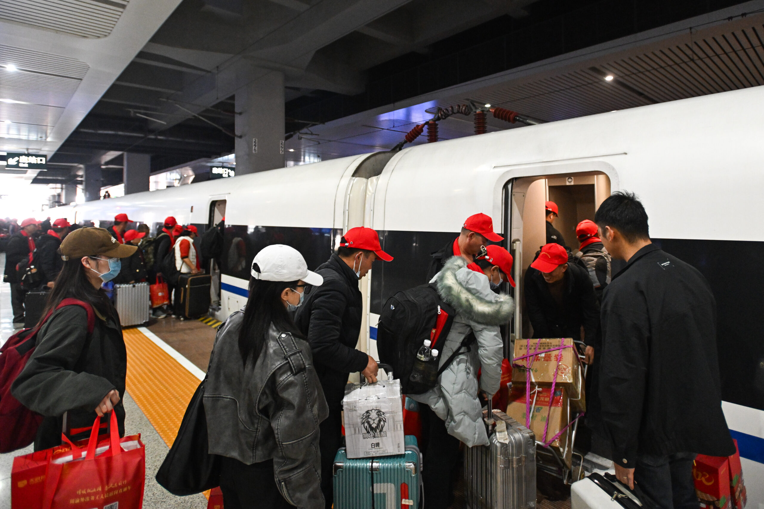 2月19日,重庆西站,务工人员乘坐返岗专列前往广州。当日,川渝两地近400名务工人员乘坐G3729次列车从重庆西站出发,前往广东。据悉,这是春节后从重庆开行的首趟返岗务工专列,也是重庆、四川、广东三地人社部门定制打造的首批返粤专列,通过“点对点”的方式,把外出务工人员从家门口“一站直达”厂门口。