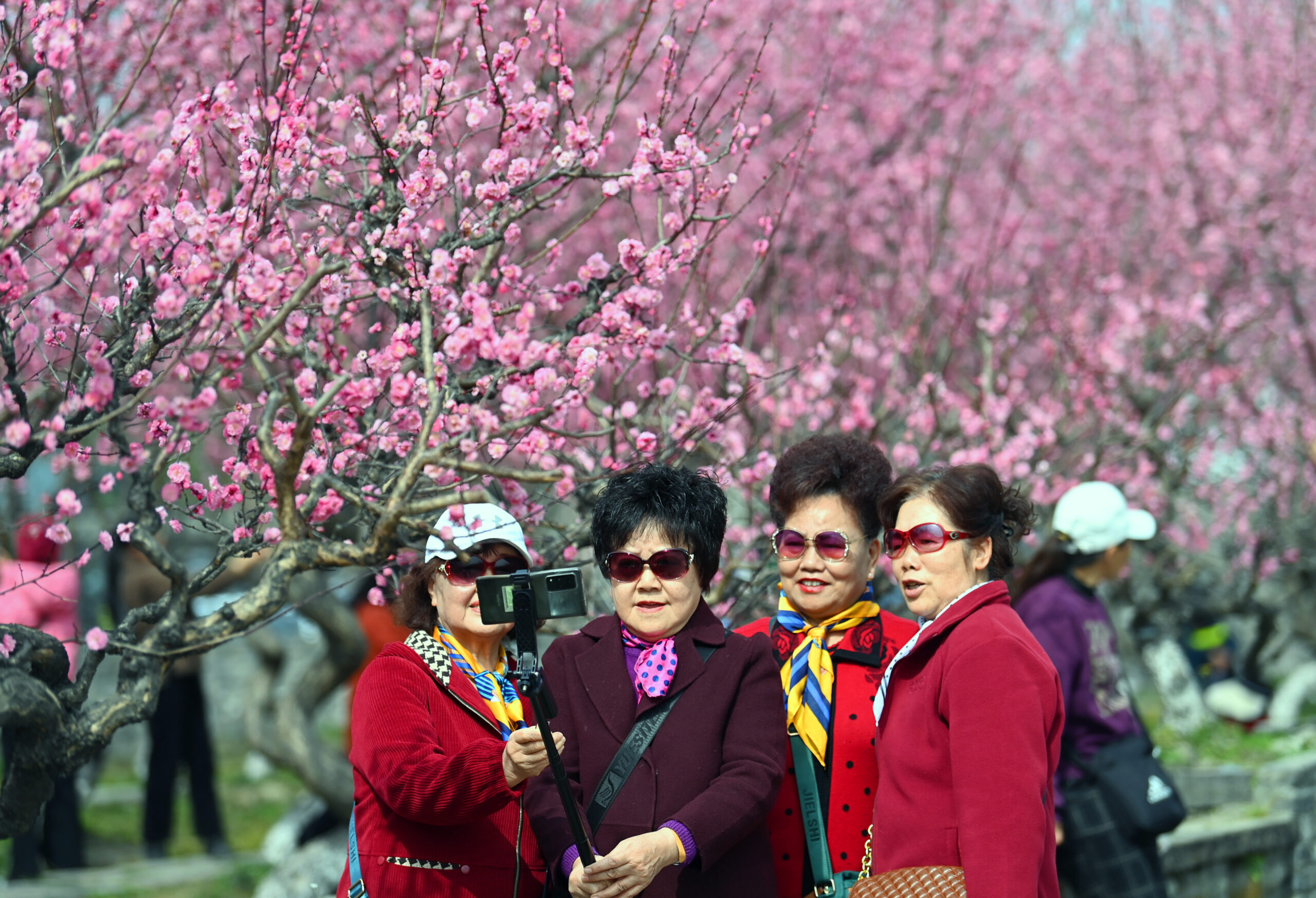 2月19日,四川都江堰问花村梅花盛开,吸引众多民众前来赏梅。图为游客在梅林里拍照留念。