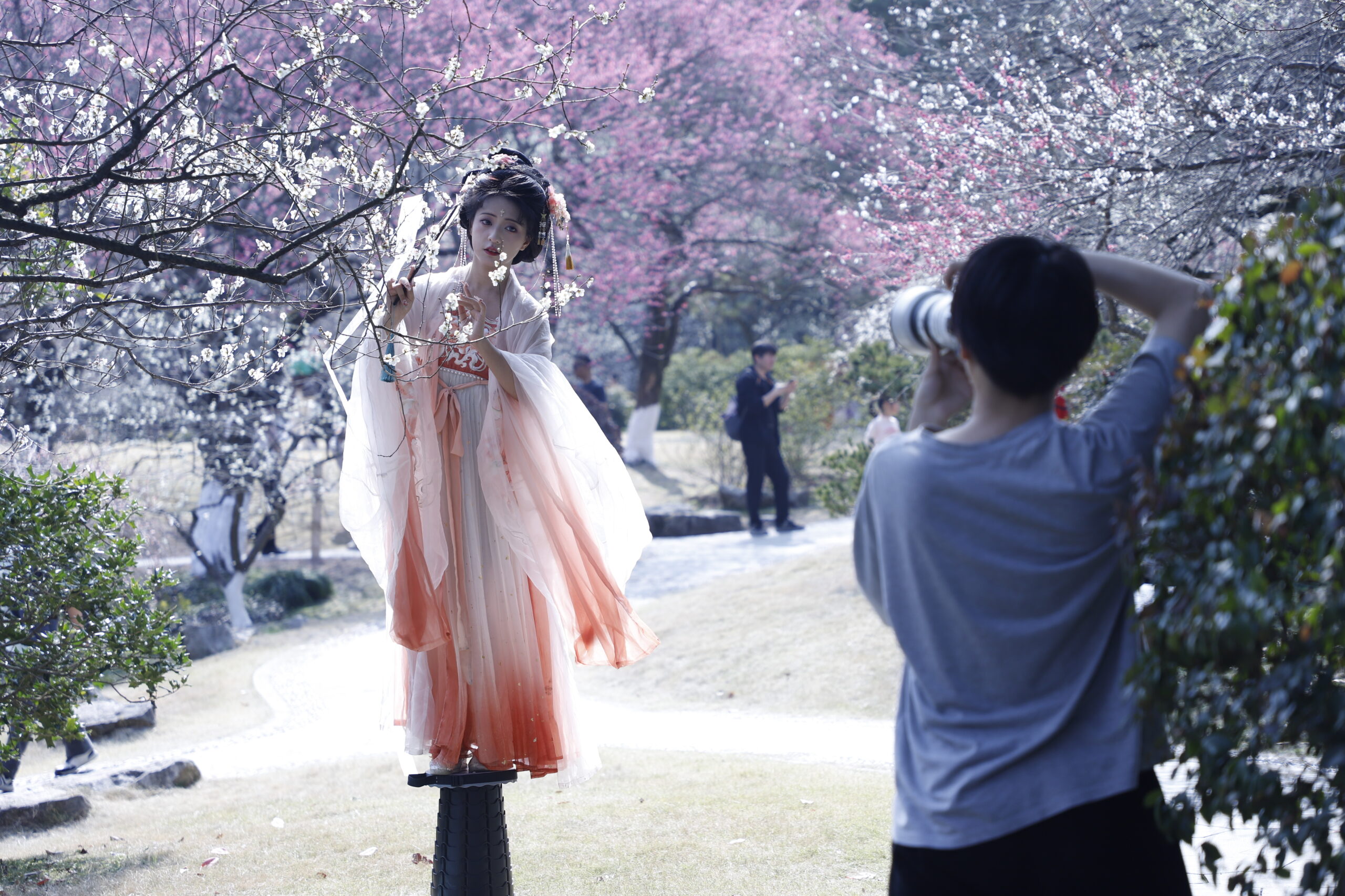 2月19日,浙江杭州,游人身着国风款式服装与梅花合影留念。近日,杭州植物园内的梅花林进入最佳观赏期。据悉,目前整个景区共有梅花品种百余种,计5000余株。