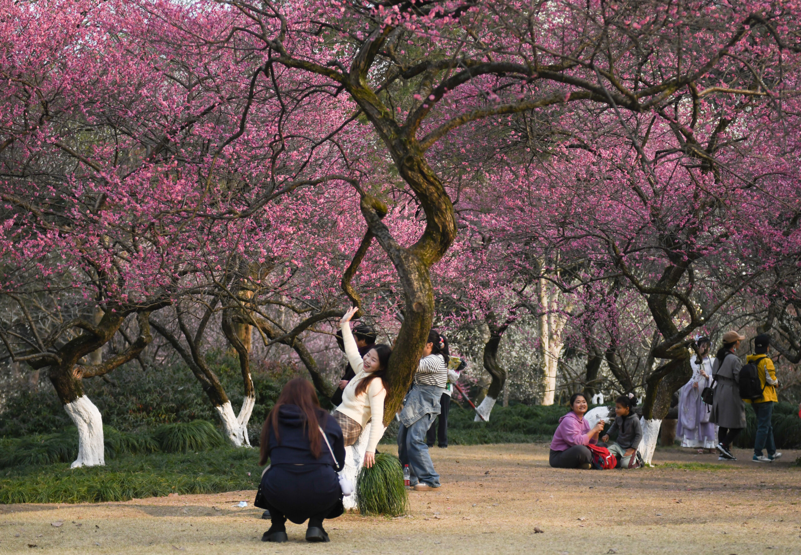 2月19日,游人在梅花林赏梅、游览。近日,浙江杭州西湖景区杭州植物园内百余种梅花盛放,吸引市民游客前往灵峰景点探梅、赏梅。