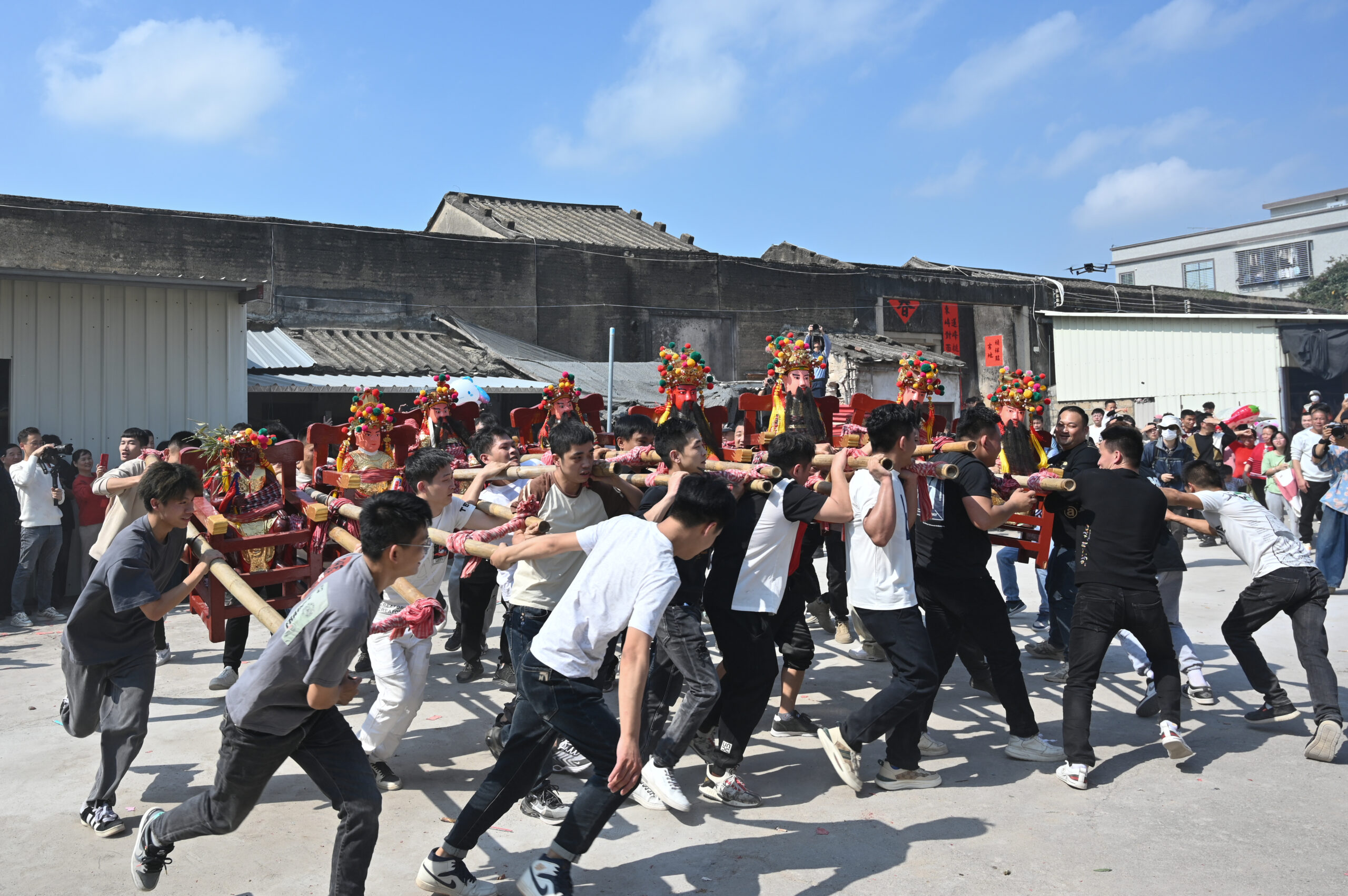 2月20日,广东潮州溪美寨村举行游神民俗活动,村民抬起神像奔跑,撞寨门,寓意齐心协力、同舟共济、新年兴旺发达。