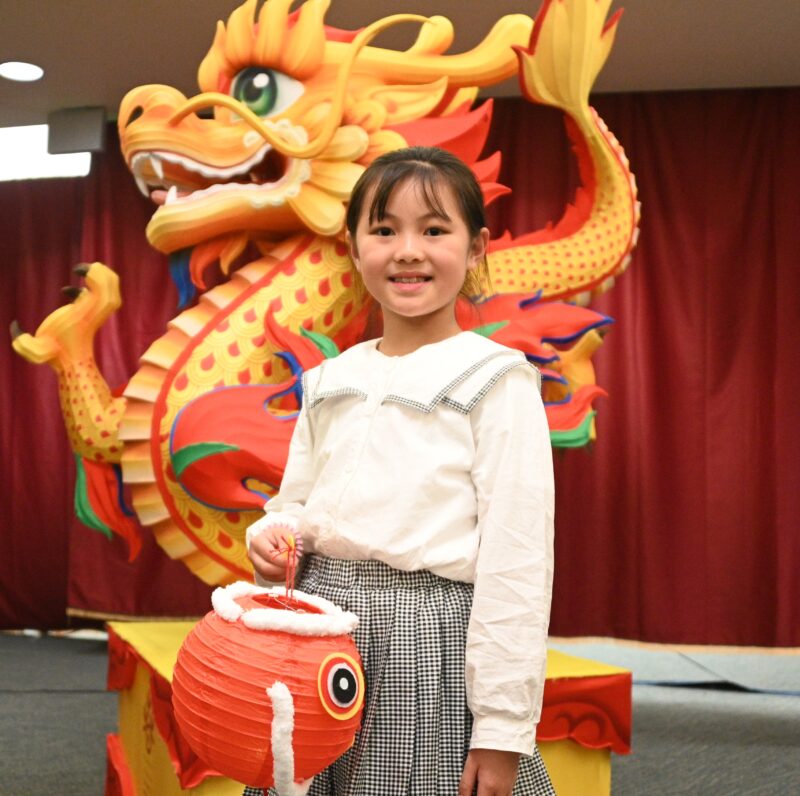柴茝小朋友拎着灯笼,开心地与龙灯合影
