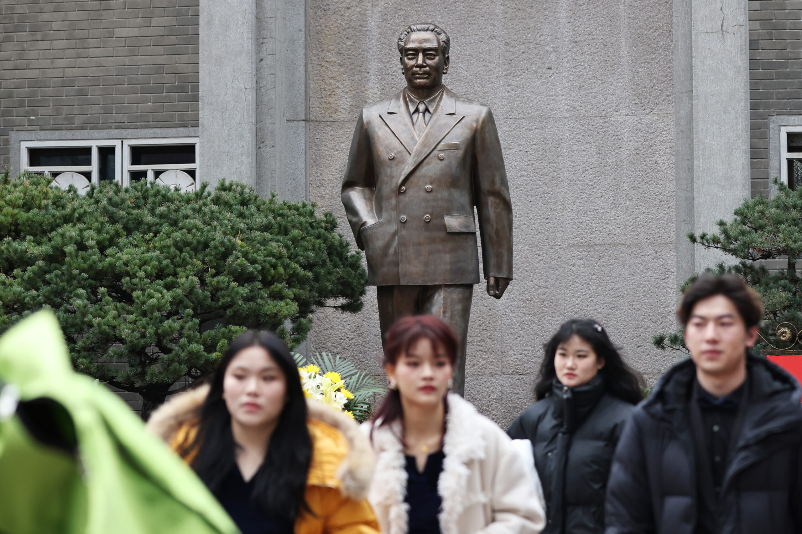3月5日,江苏南京,“永远的怀念”——纪念周恩来同志诞辰126周年系列活动在中国共产党代表团梅园新村纪念馆举行。来自当地的大中小学生、企业员工等朗诵了《西花厅外,海棠花开》《您从这里走来》《梅园里的308天》等诗歌,深切缅怀周恩来。图为参加活动的大学生从周恩来铜像前走过。