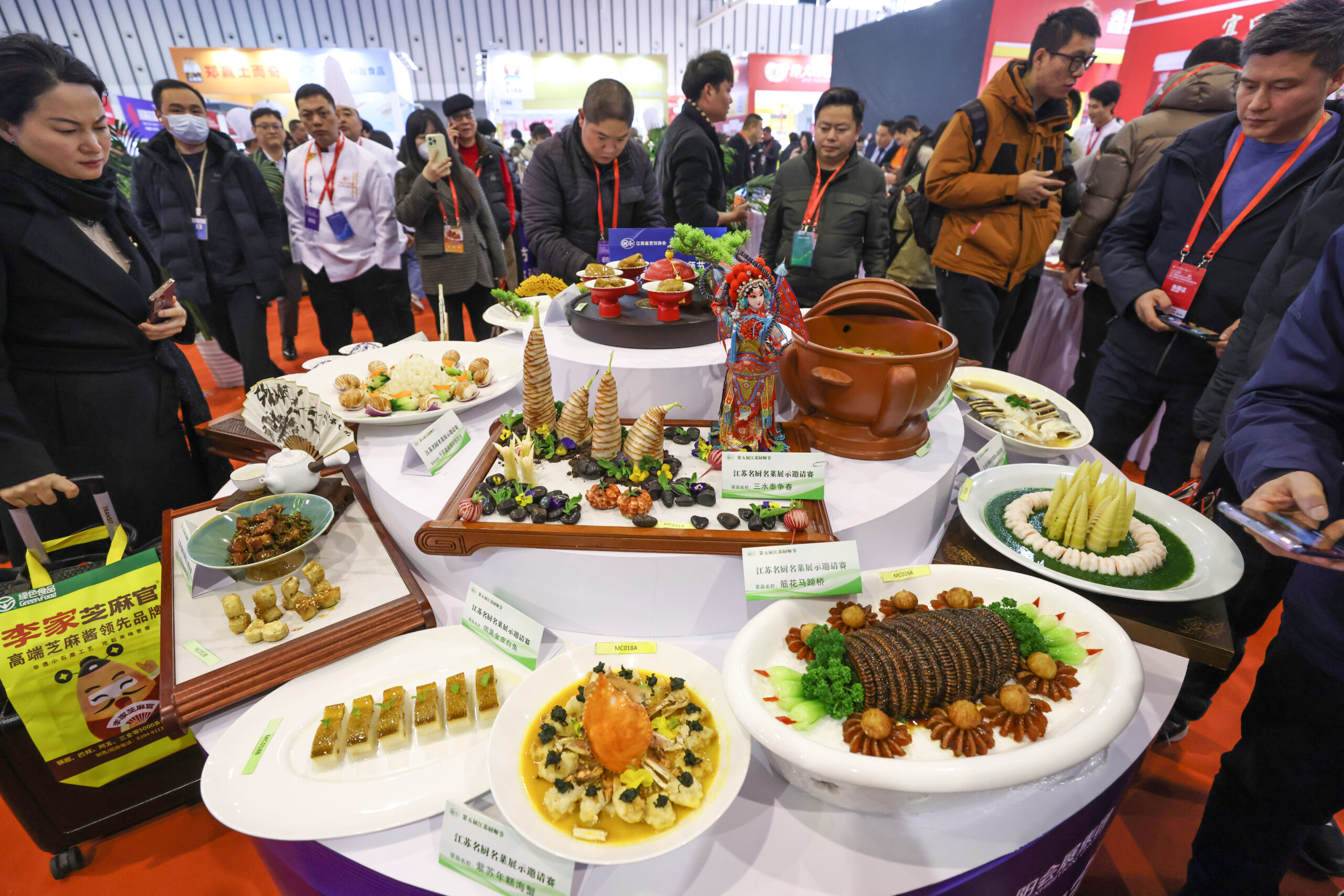 3月6日,江苏南京,参观者在餐饮业博览会上欣赏展出的精美菜肴。该博览会汇聚了来自全国各地餐饮企业的餐饮食材、酒水饮品、火锅底料及调味品、餐厨设备以及餐饮食品包装材料,现场举办创新厨艺交流赛、淮扬菜创新大赛等,吸引了众多业内人士前来参观洽谈,共同探索餐饮行业新趋势。