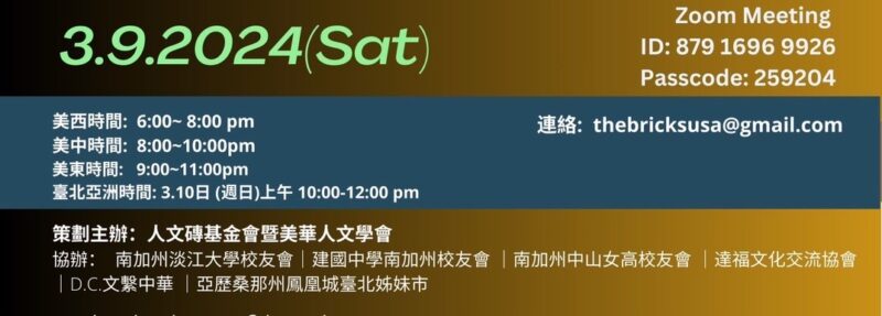 时间:3月9 日 2024 年(周六)晚上,美西时间 6:00~ 8:00 pm,美中时间8:00~10:00pm