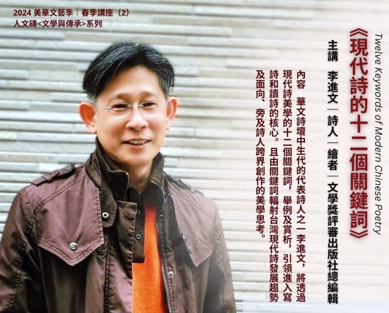 内容:华文诗坛中生代的代表诗人之一李进文先生,将透过现代诗美学的12个关键词,举例及赏析,引领进入写诗和读诗的核心。且由关键词辐射台湾现代诗发展趋势及面向、旁及诗人跨界创作的美学思考。