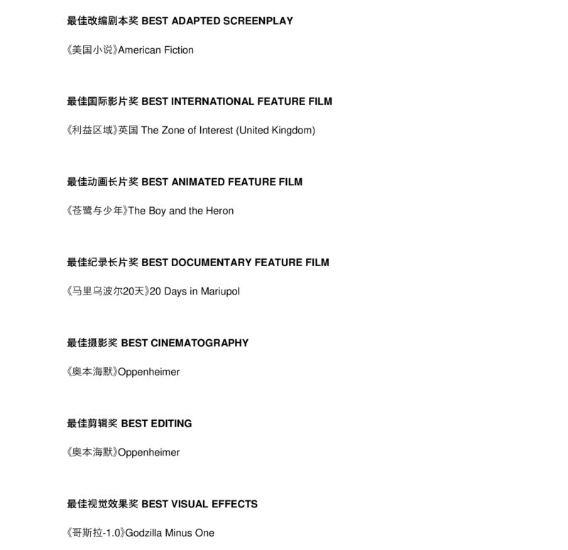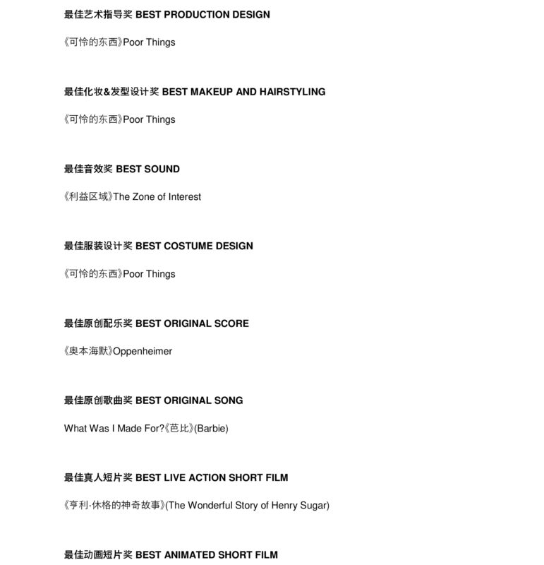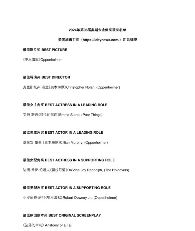 未经允许不得转载:城市新闻网icitynews » 2024年第96届奥斯卡金像奖获奖名单出炉!