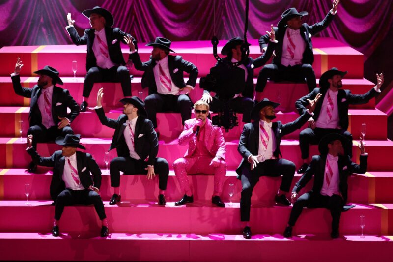 在颁奖典礼上,同样令观众激动不已的是,入围最佳男配角的瑞恩·高斯林(Ryan Gosling)在现场献唱了他的奥斯卡提名歌曲《芭比》主题曲《我只是肯》(’m Just Ken),将他的“肯能量(Kenergy)”推向了一个新的高度。在粉色和水钻的灿烂中,高斯林戴着芭比娃娃风格的太阳镜,与一群伴舞同台表演,其中包括他在《芭比》中共同演绎不同版本的肯的搭档,刘思慕(Simu Liu)和本·金斯利-阿代尔(Ben Kingsley-Adair),成为了表演的焦点。在表演过程中,高斯林更是走向观众席,将麦克风递给了《芭比》的联合主演亚美莉卡·费雷拉(America Ferrera)、玛格特·罗比(Margot Robbie)以及导演格蕾塔·葛韦格(Greta Gerwig),与他们一起共同演唱了这首歌曲,现场气氛达到了高潮。