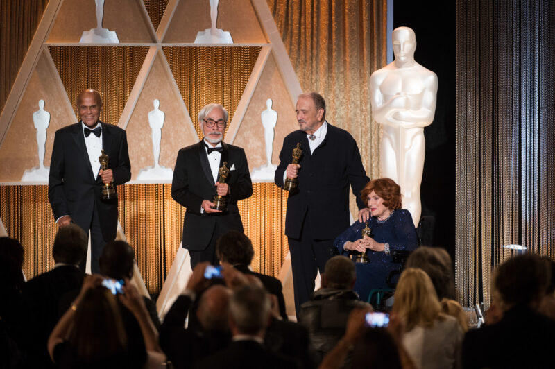 The 6th Annual Governors Awards in The Ray Dolby Ballroom at Hollywood & Highland Center® in Hollywood, CA, on Saturday, November 8, 2014. Pictured (left to right): Jean Hersholt Humanitarian Award recipient Harry Belafonte, Honorary Award recipient Hayao Miyazaki, Honorary Award recipient Jean-Claude Carrière and Honorary Award recipient Maureen O’Hara