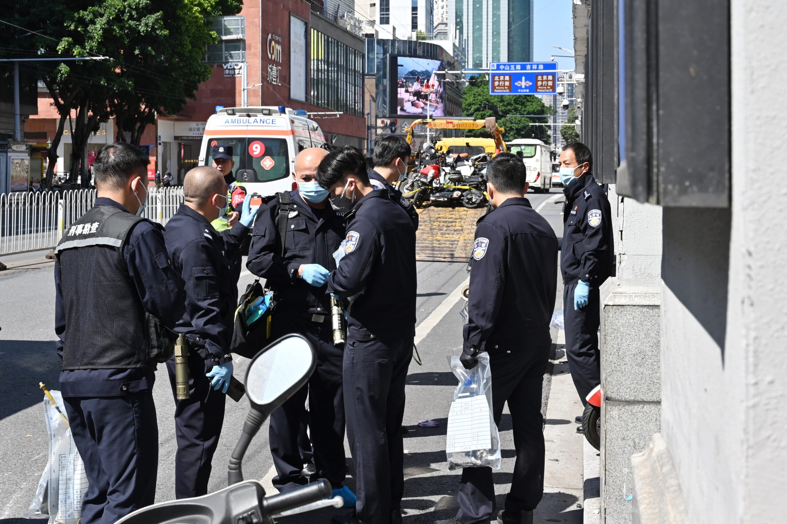 3月12日,广州市公安局交通警察支队通报,2024年3月12日9时许,一辆小汽车先后在广州市越秀区中山四路、广仁路与行人和电动自行车发生碰撞,造成11人受伤。图为工作人员在中山四路清理事故现场。