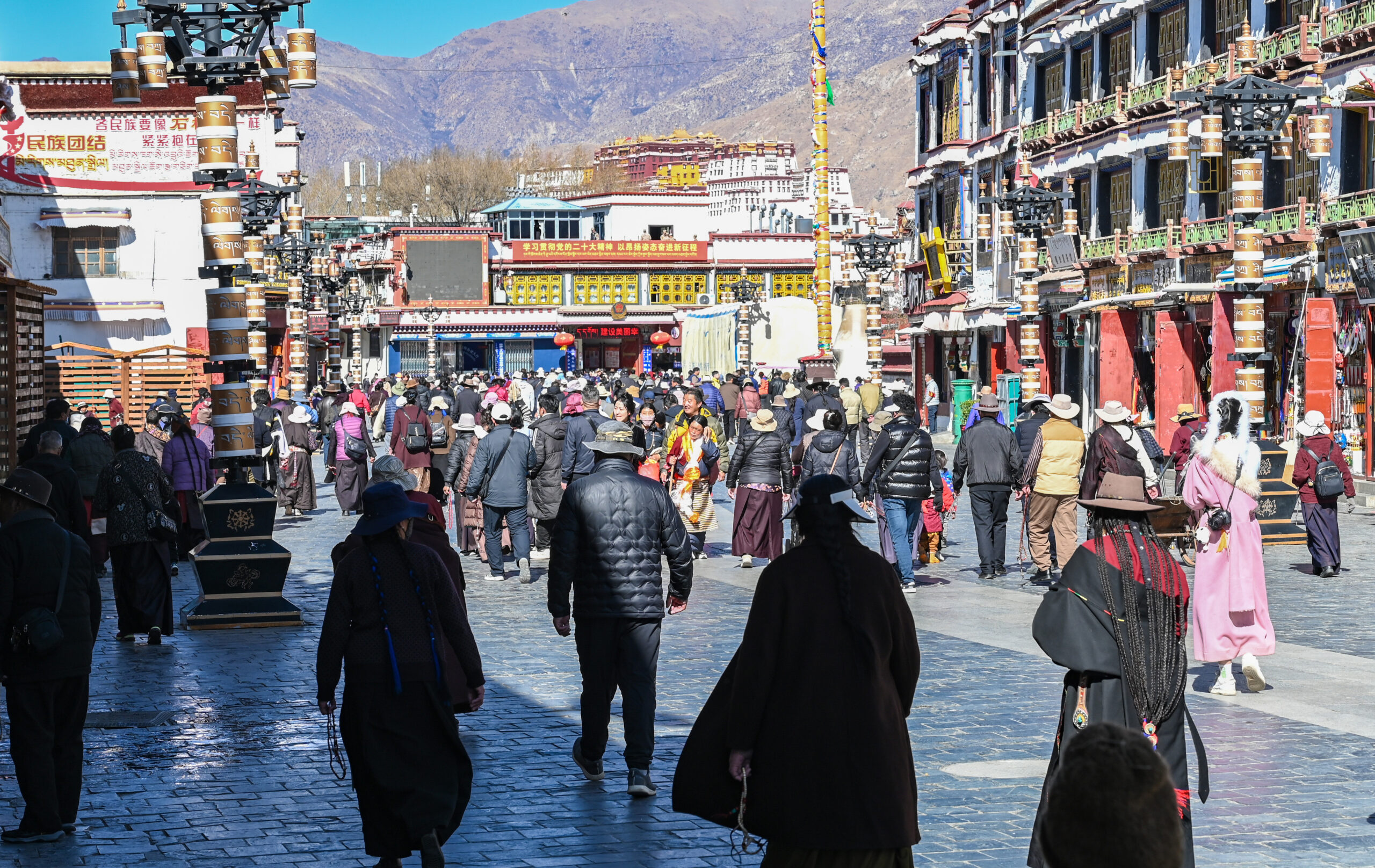 3月14日,海拔3600多米的高原古城拉萨暖意浓。图为信众、游客行走在八廓街上。
