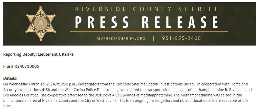据河滨郡警察局3月15日(周五)发布的一份新闻稿称,在3月12日(周三)晚上的一次联合突击行动中,当局缴获了高达4038磅的甲基苯丙胺,俗称冰毒,这是对毒品交易的一次重大打击。河滨警长特别调查局与国土安全调查局(HSI)和西科维纳警察局联手,在河滨郡和洛杉矶郡展开了打击毒品分销的行动。