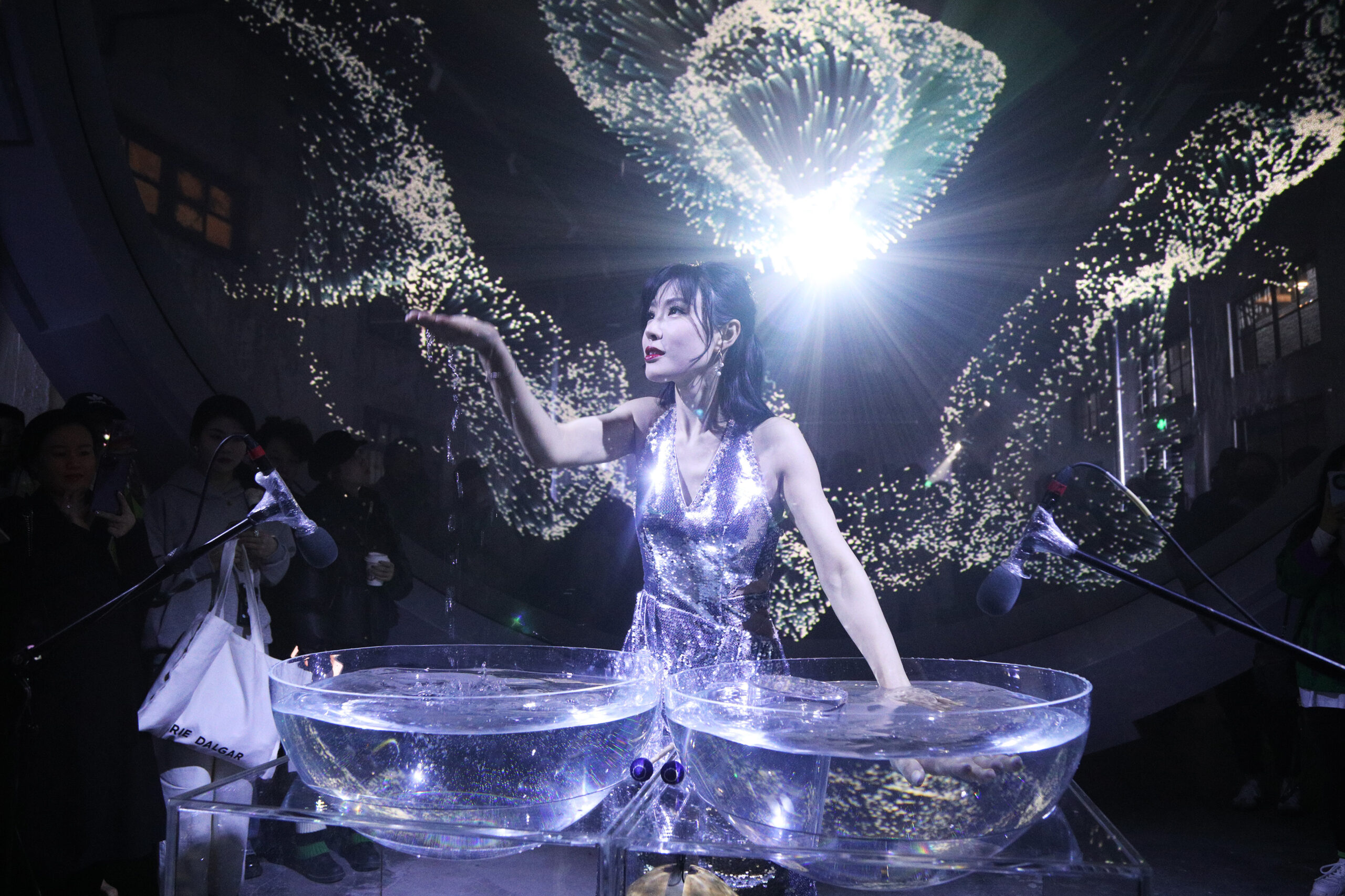 3月17日,一场名为《再野Rewild》的参与式肢体戏剧在上海金桥EKA·天物空间举行。现场观众游走、沉浸、参与在舞台之中,并通过美学感知,引发对生态与环境议题的思考。图为演员敲击水面演奏别具一格的打击音乐。