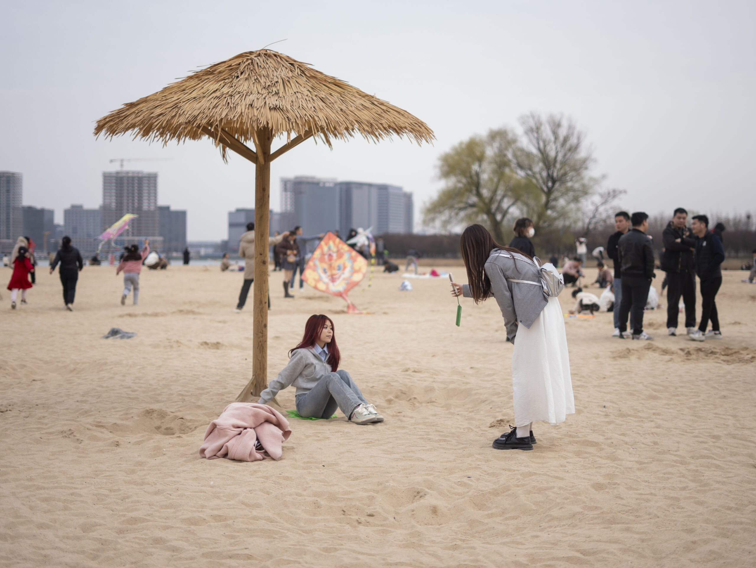 3月17日,河南郑州北龙湖岸边一处网红人工沙滩吸引游人拍照打卡、挖沙玩乐。图为人工沙滩一角吸引游人拍照打卡。