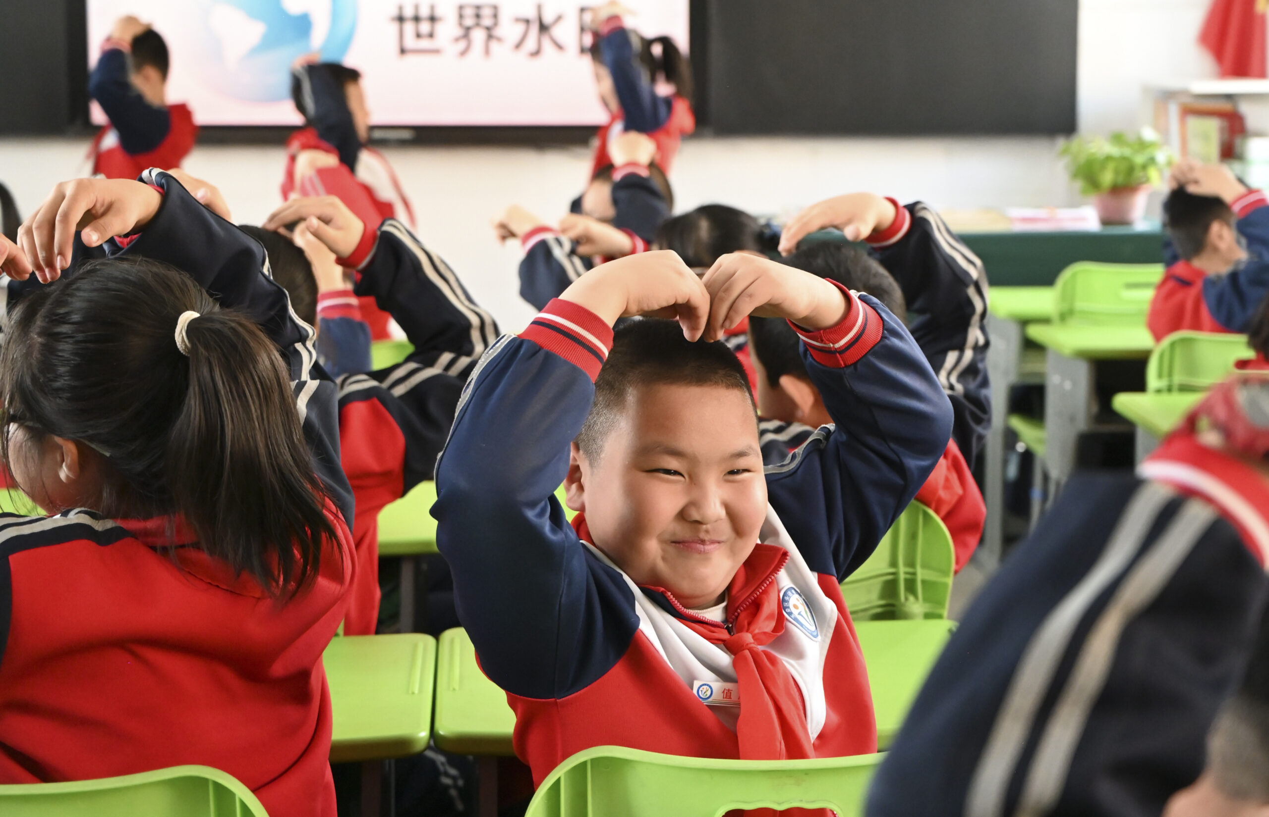 3月21日,内蒙古呼和浩特市,小学生做“小水滴”操。当日,呼和浩特市头道巷小学内,学生们在课堂上做“小水滴”操,绘保护水资源海报,迎接世界水日。 未经允许不得转载:城市新闻网icitynews » 呼和浩特:小学生上节约用水主题课 迎世界水日