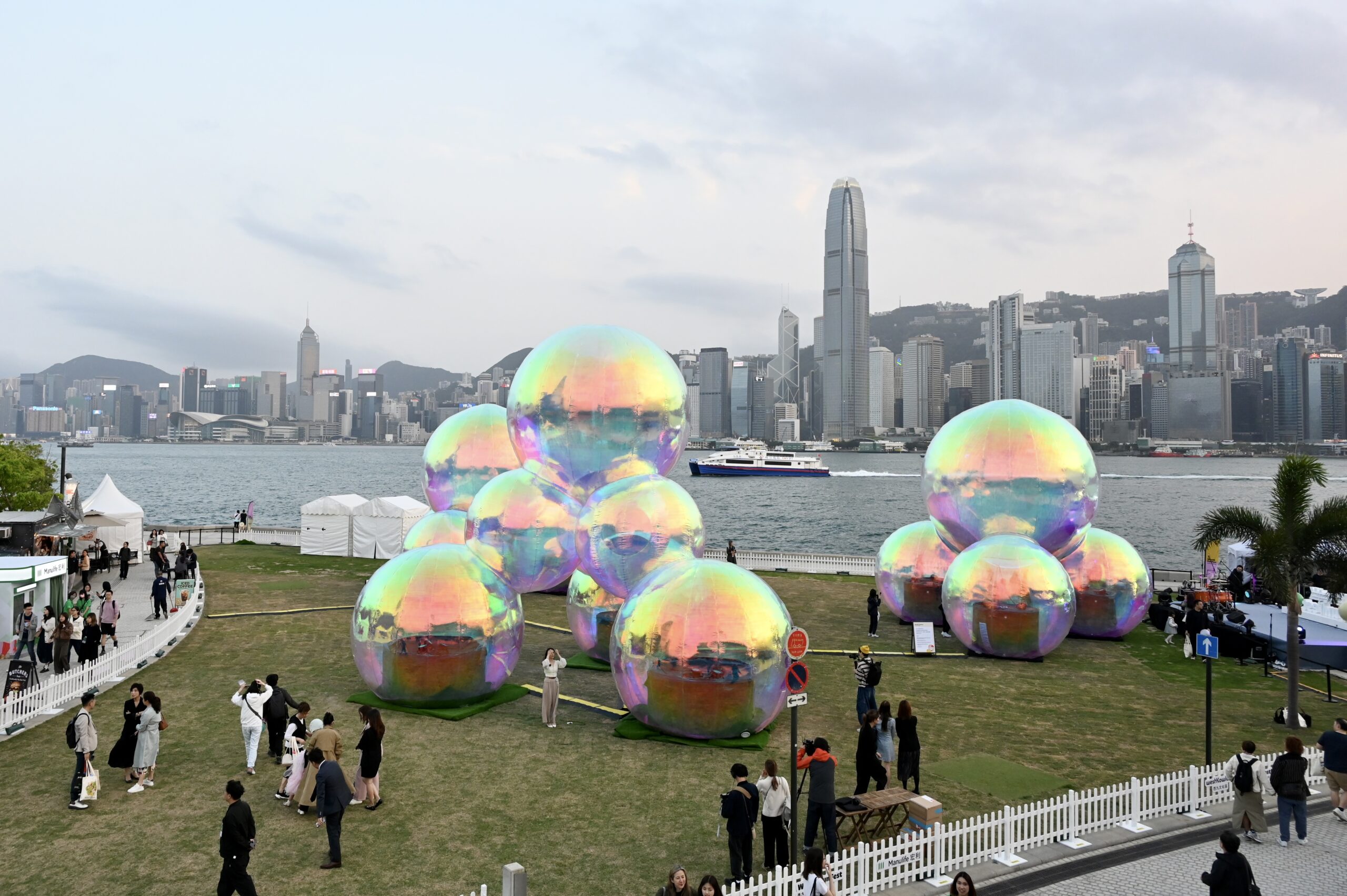 3月21日,香港西九文化区展出由澳大利亚艺术团队创作的大型艺术装置《抱泡瞬间》,该作品曾在悉尼、新加坡等40多个地方展出,耀眼泡泡的外貌随日照转变,融入香港维多利亚港醉人景色。