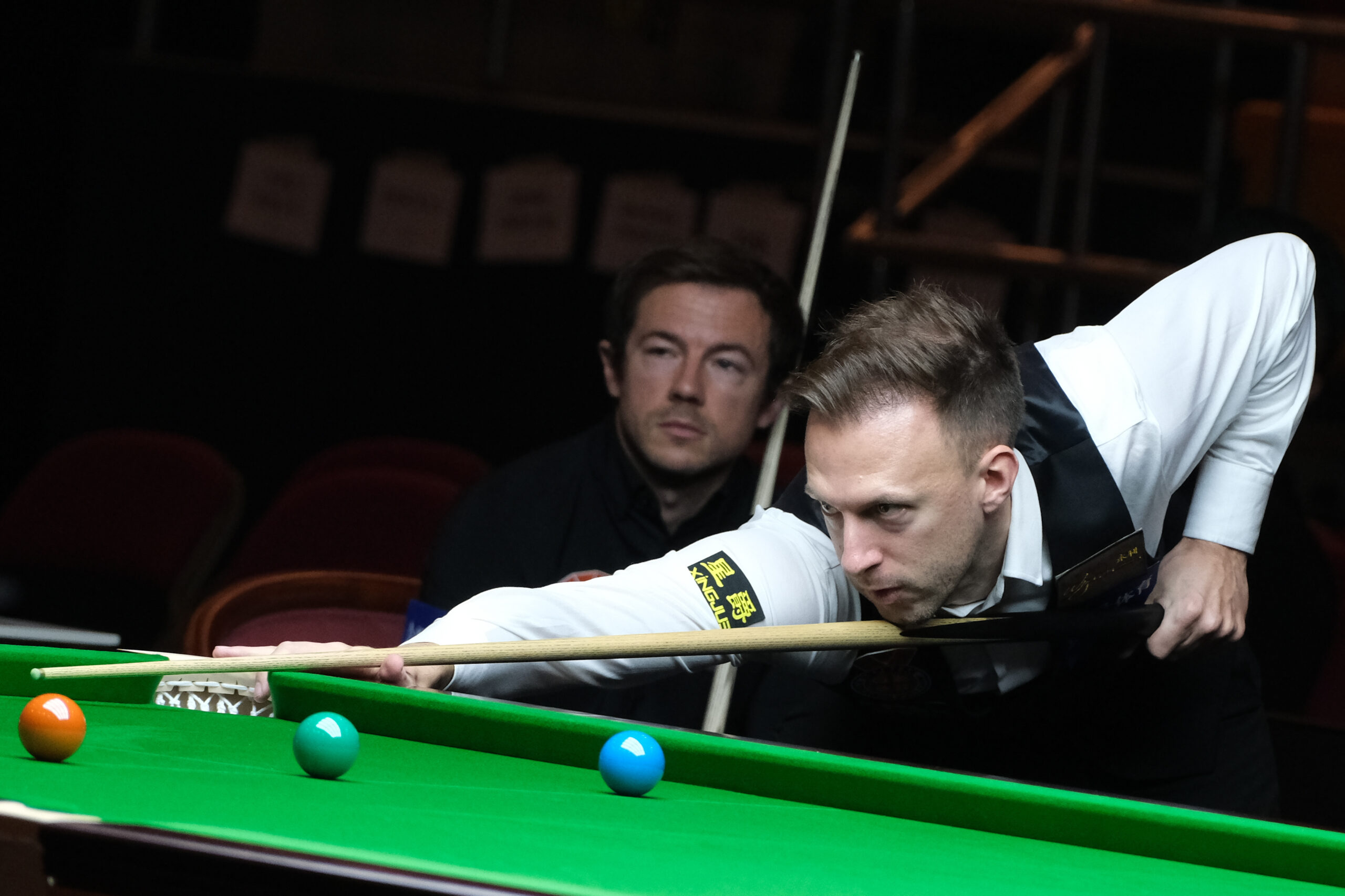 3月25日,2024年香港国际桌球明星挑战赛在香港伊利沙伯体育馆开杆,赛事包括罗尼·奥沙利文(Ronnie O’Sullivan)对马克·威廉姆斯(Mark Williams)、贾德·特鲁姆普(Judd Trump)对杰克·利索夫斯基(Jack Lisowski)等,吸引球迷到场观赛。图为贾德·特鲁姆普(前)对杰克·利索夫斯基。