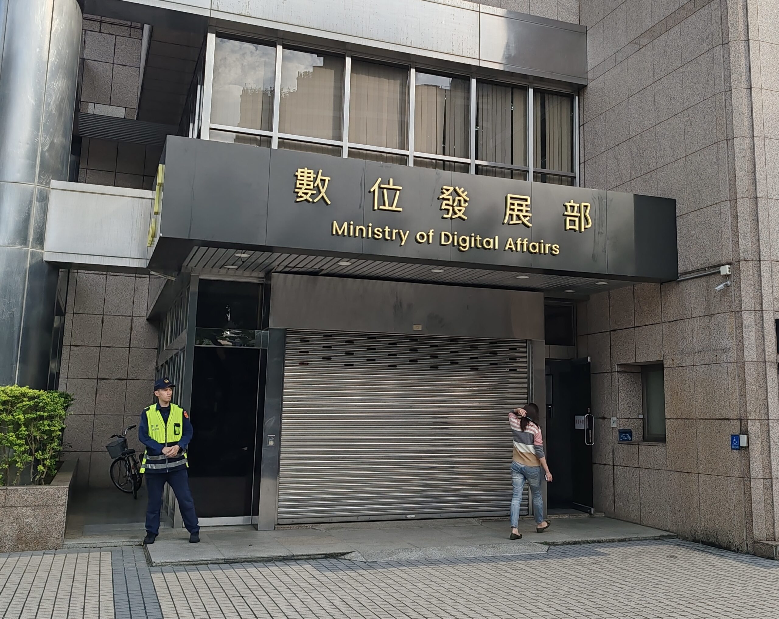 3月28日,台湾一男子持枪朝行政当局“数位发展部”大楼连开三枪,造成玻璃大门碎裂,现场无人员伤亡。图为当天下午的“数位发展部”楼下,遭枪击的大门已关闭,工作人员须由小门进出。