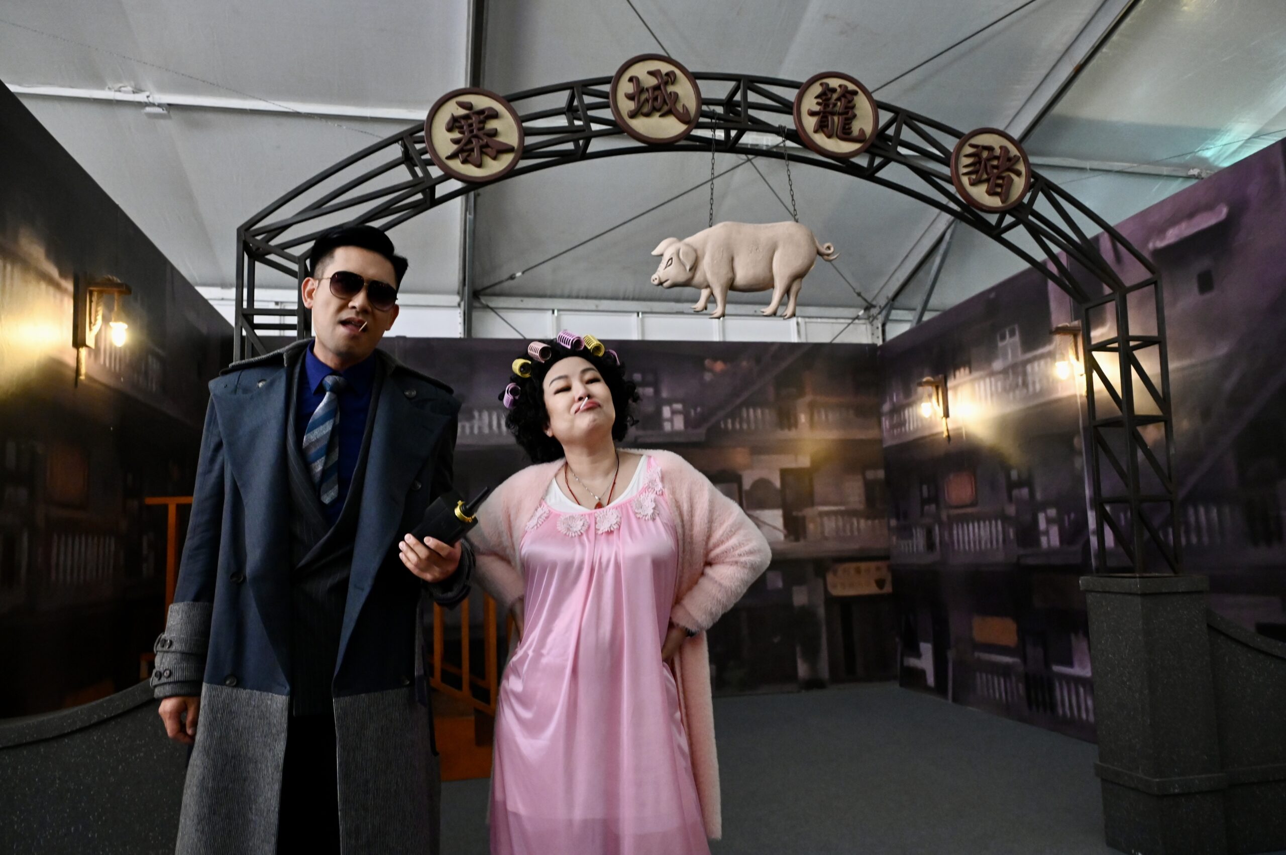 4月5日下午,香港特区政府康乐及文化事务署在维多利亚公园举行香港流行文化节2024节目巡礼,让传媒率先了解节目内容。该活动以“也文也武”为主题,包括专题展览、电影放映、舞台节目及外展活动,内容涵盖文学、各种艺术以至武术,全方位呈现香港多元流行文化能文能武。开幕节目“天空草地” 将于4月6日至7日在香港维多利亚公园举行,邀请来自不同界别及不同地域的名人艺人参与表演。图为“超时空打卡廊”展览中展示香港经典电影《功夫》的场景。